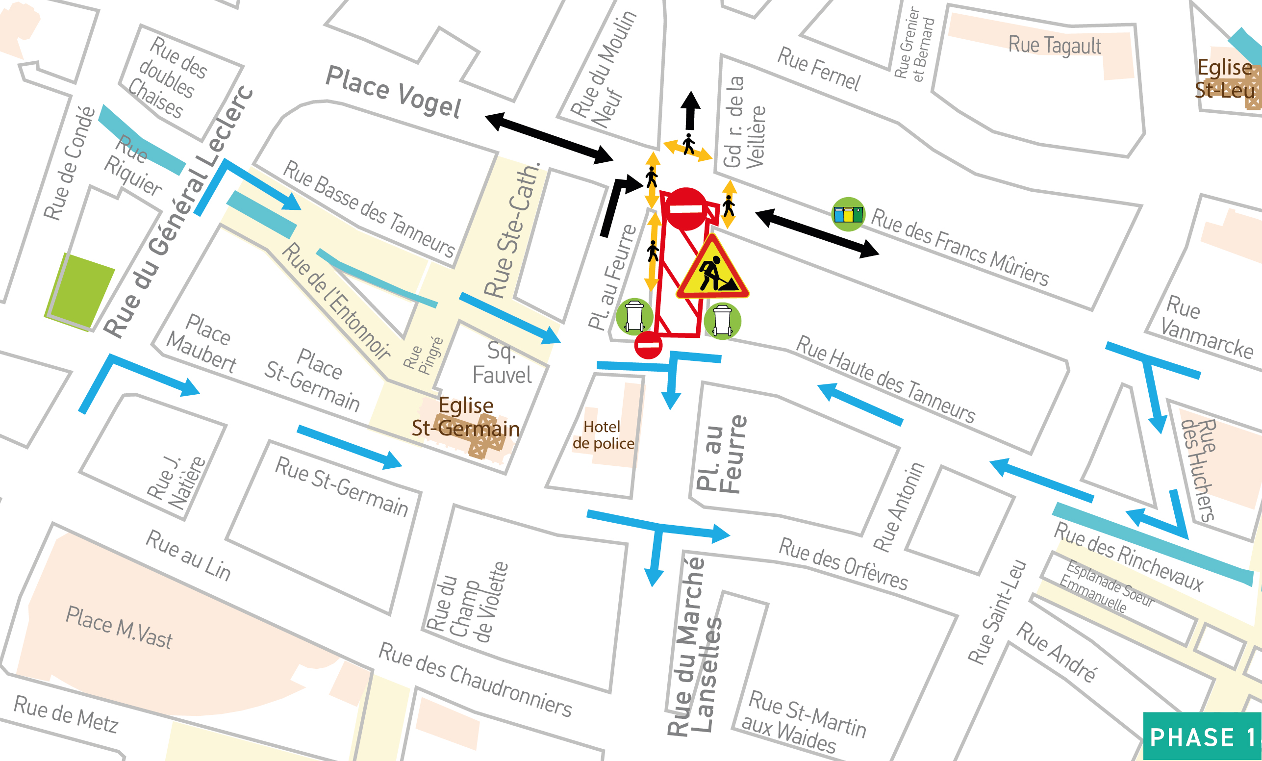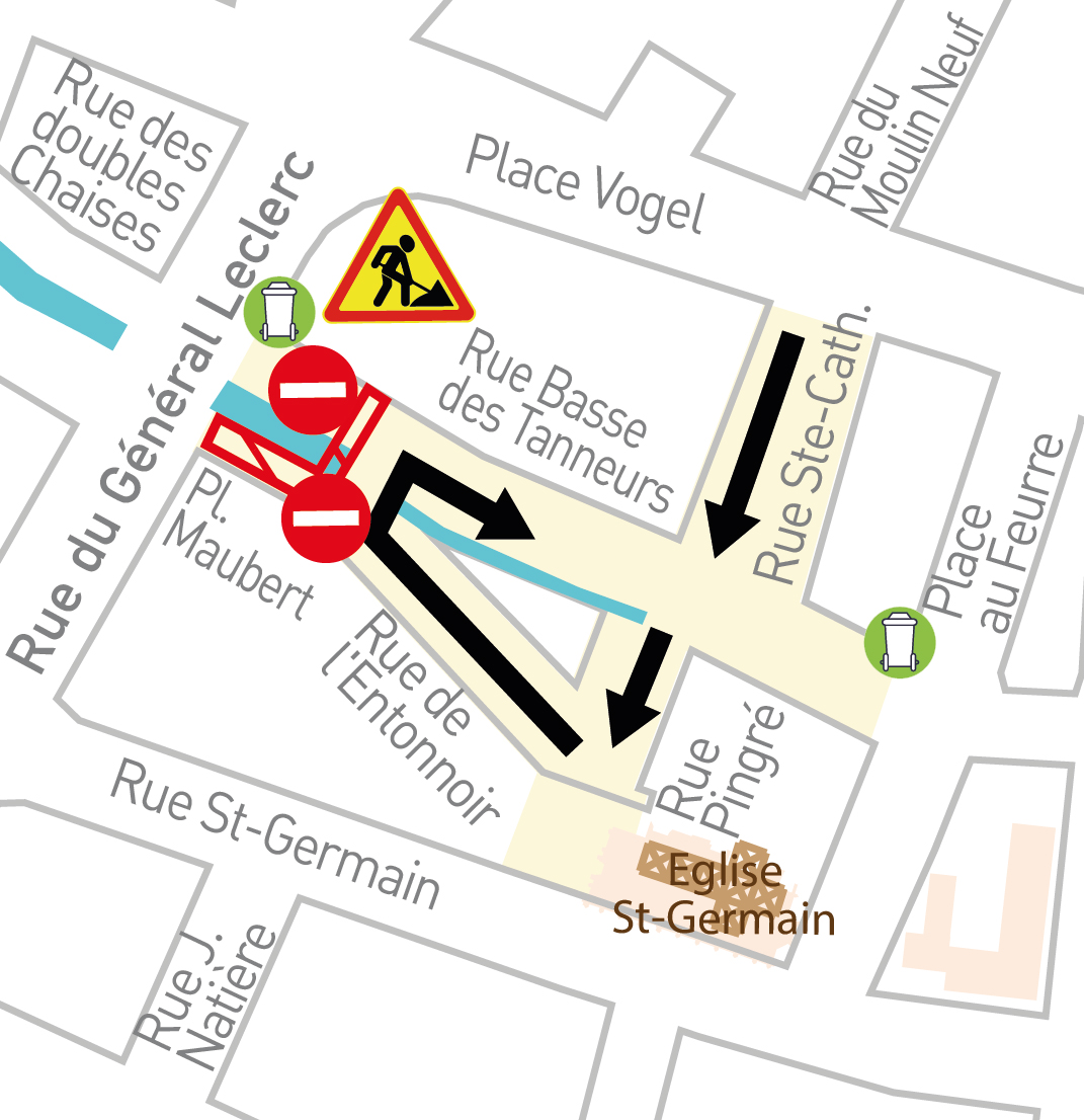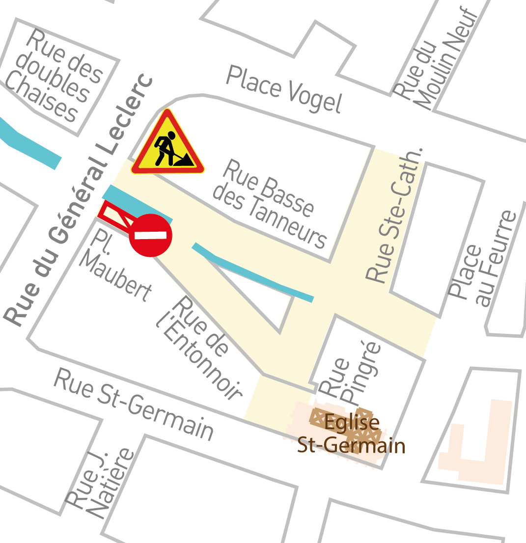 - Déviation centre-ville via les rues St-Germain, Basse des Tanneurs et des Huchers