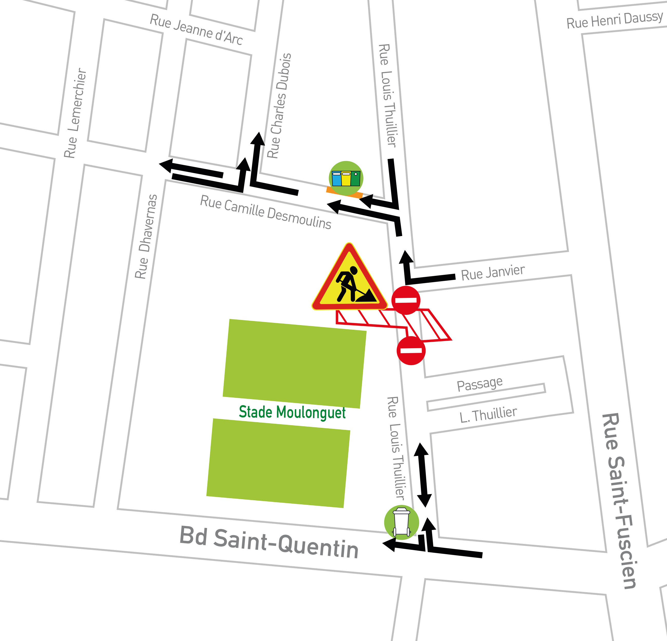 - Mise en double sens de circulation de la rue L.Thuillier jusque la zone de travaux en venant du bd St-Quentin