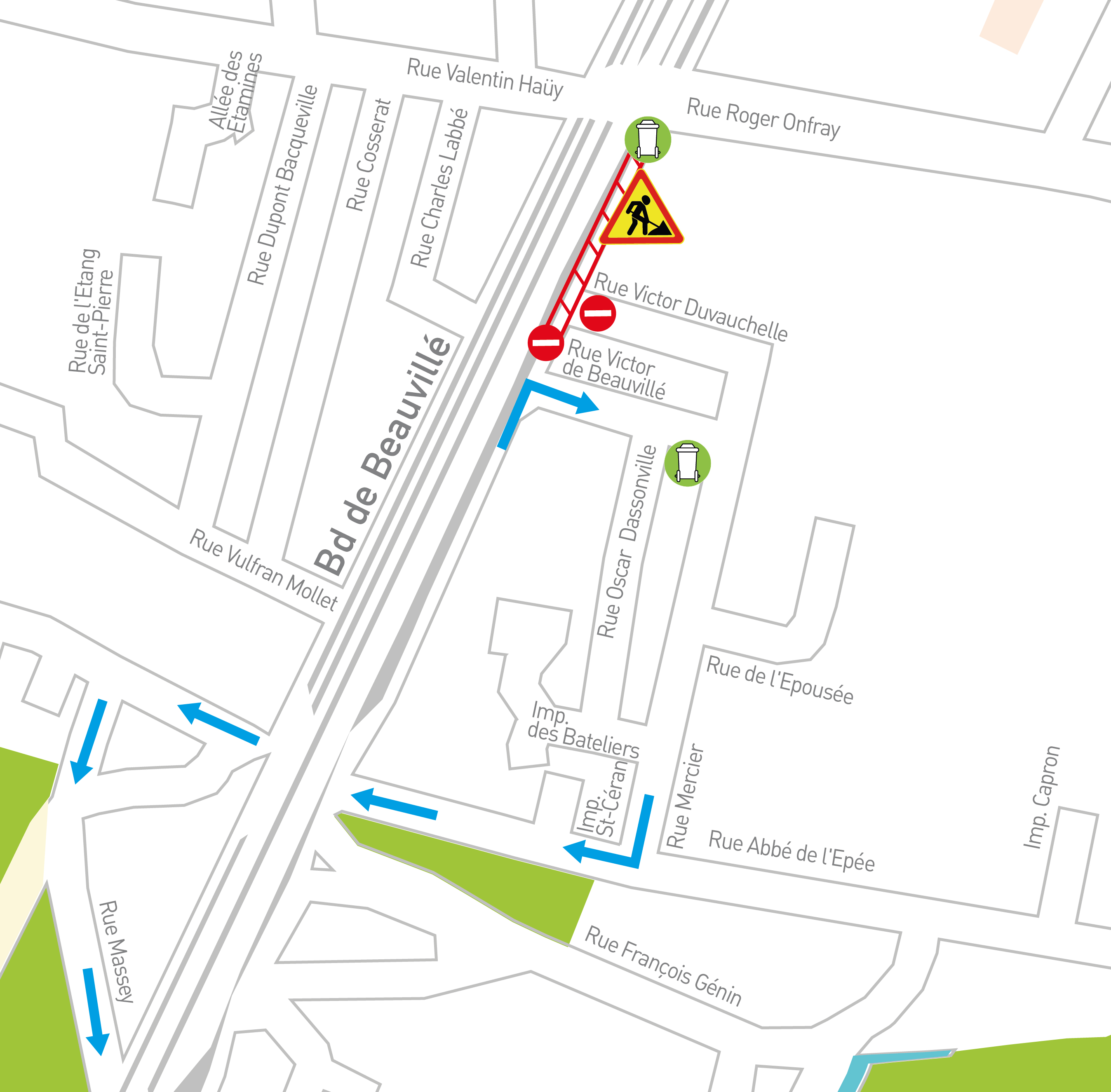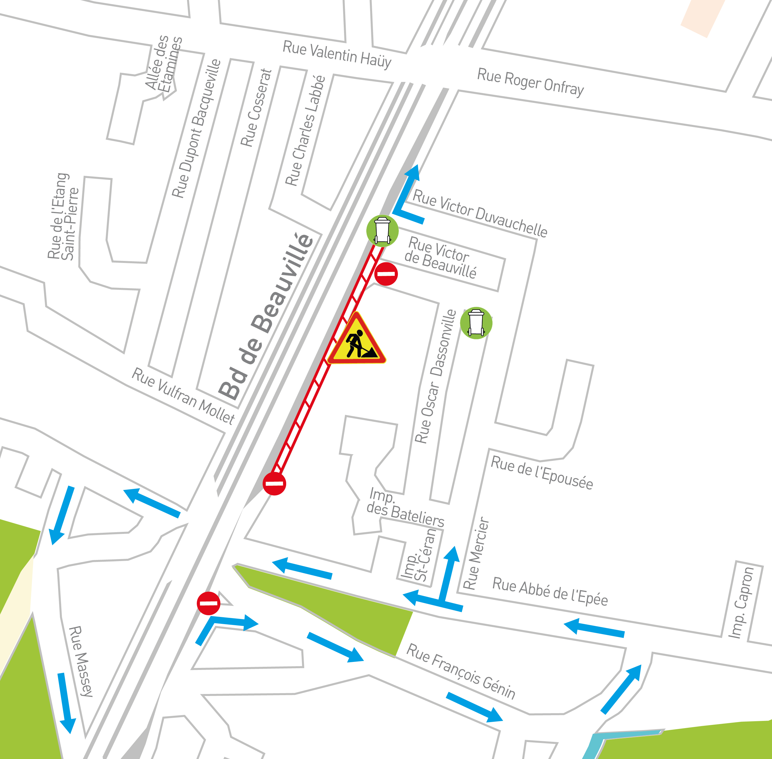 - Contre-allée du bd de Beauvillé barrée entre les rues François Génin et Victor Duvauchelle