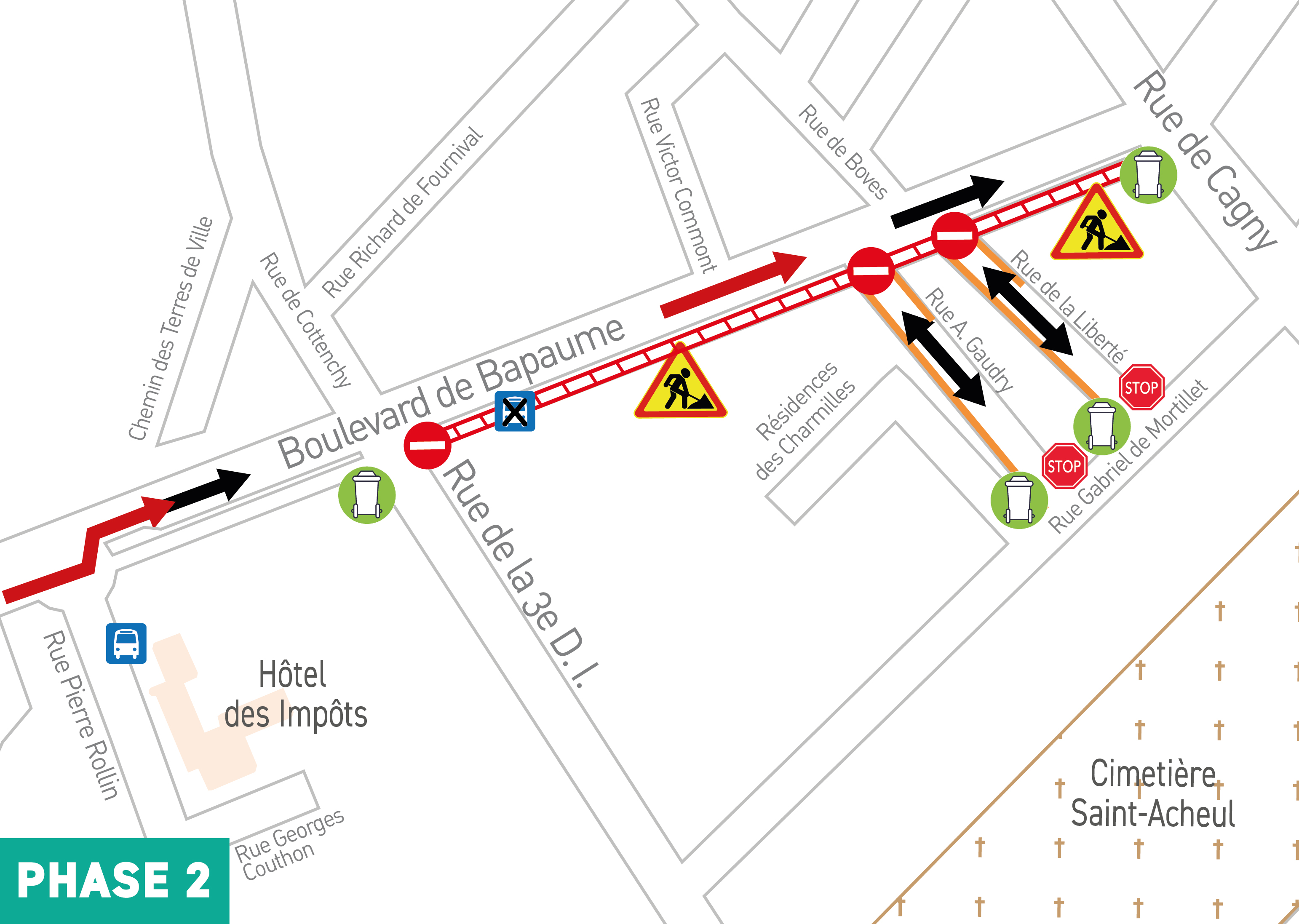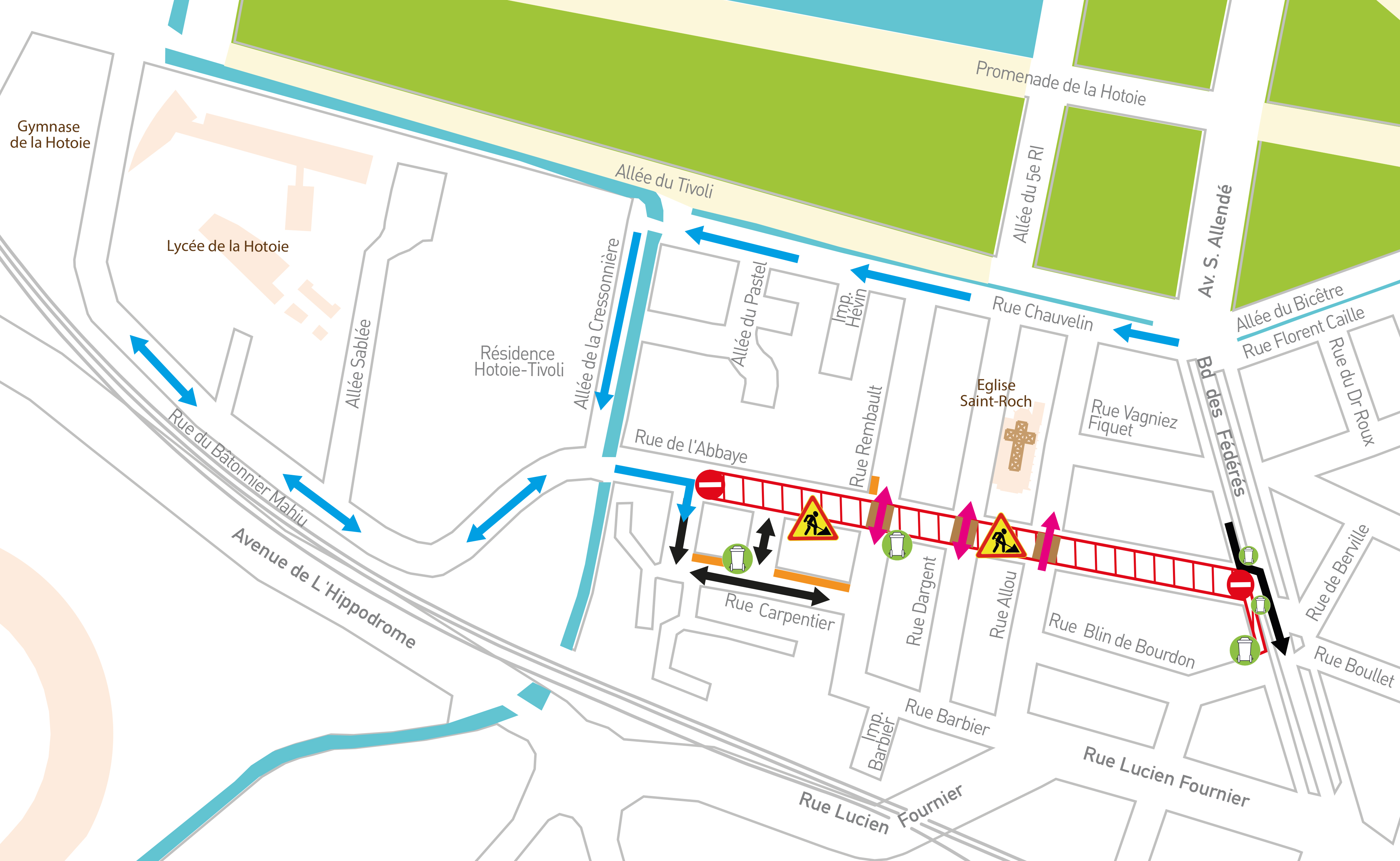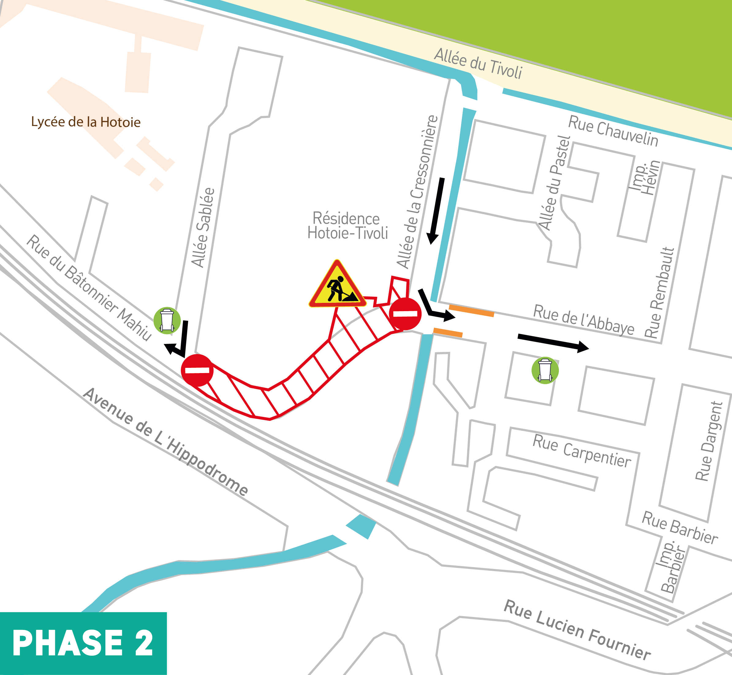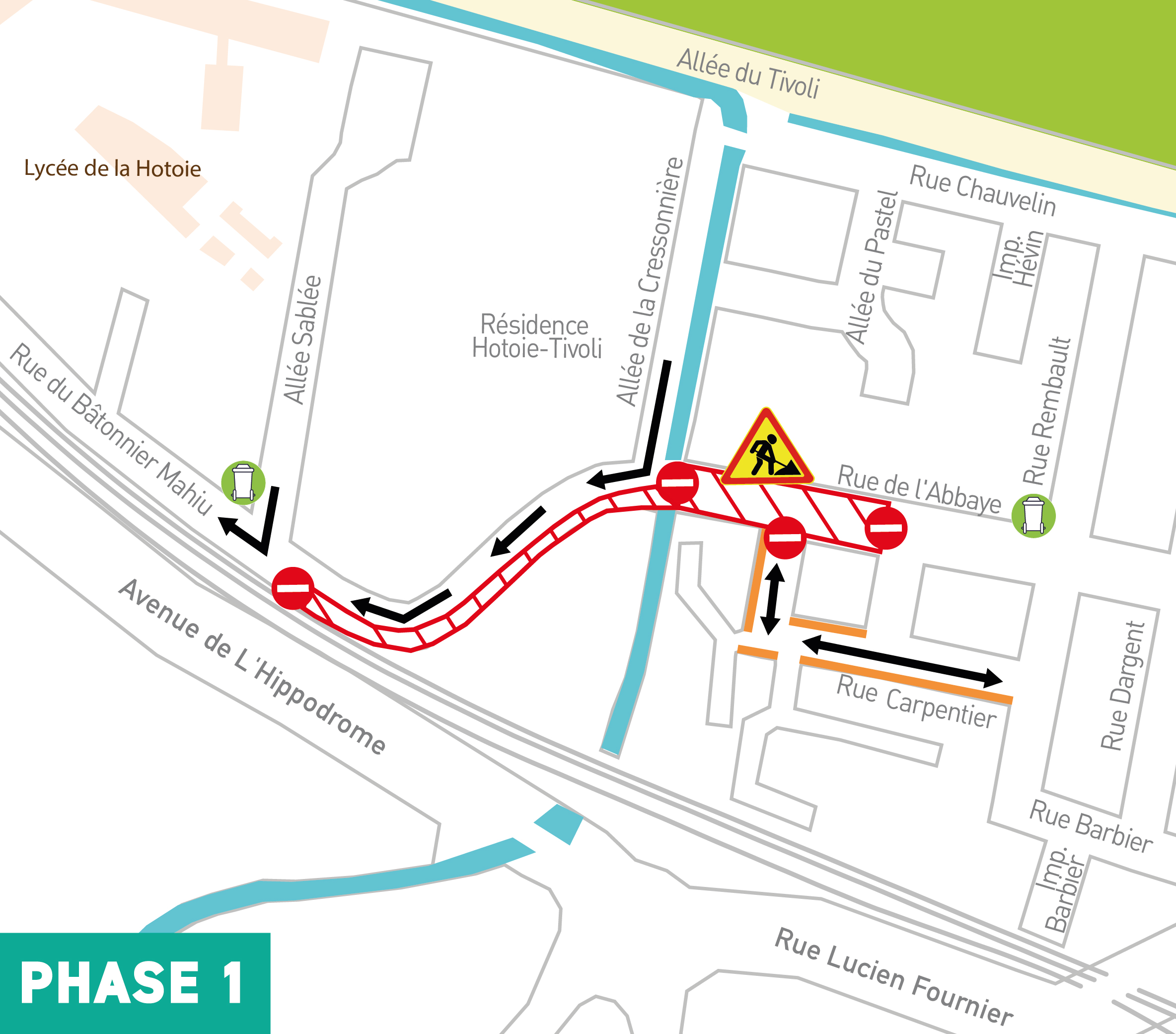 - Mise en place d’une déviation pour les accès vers l’allée Sablée et le Lycée de la Hotoie