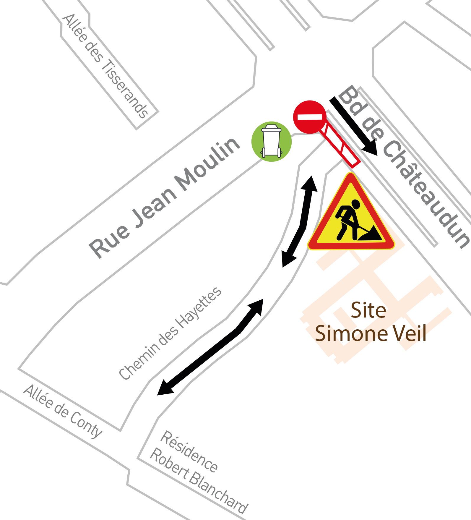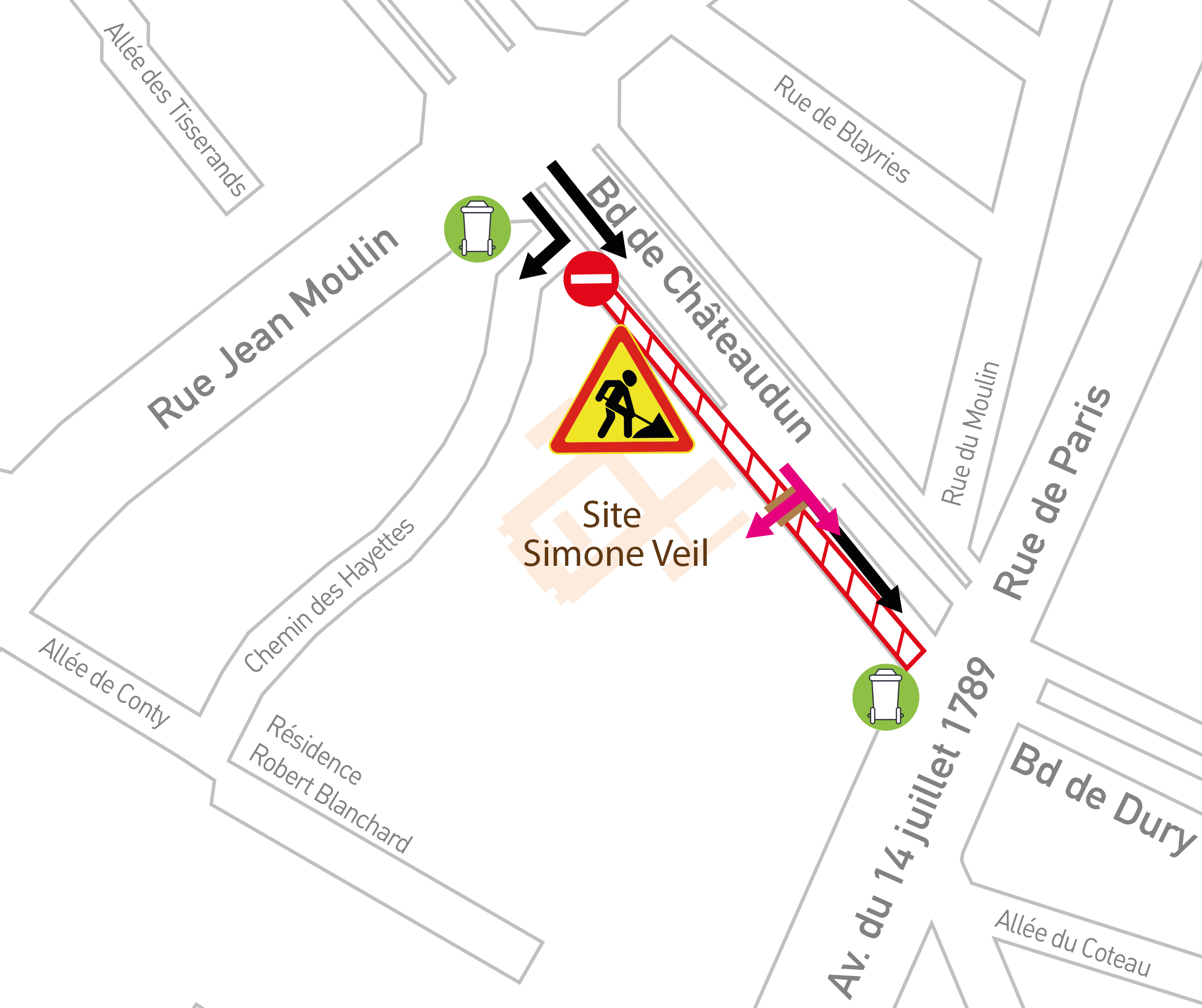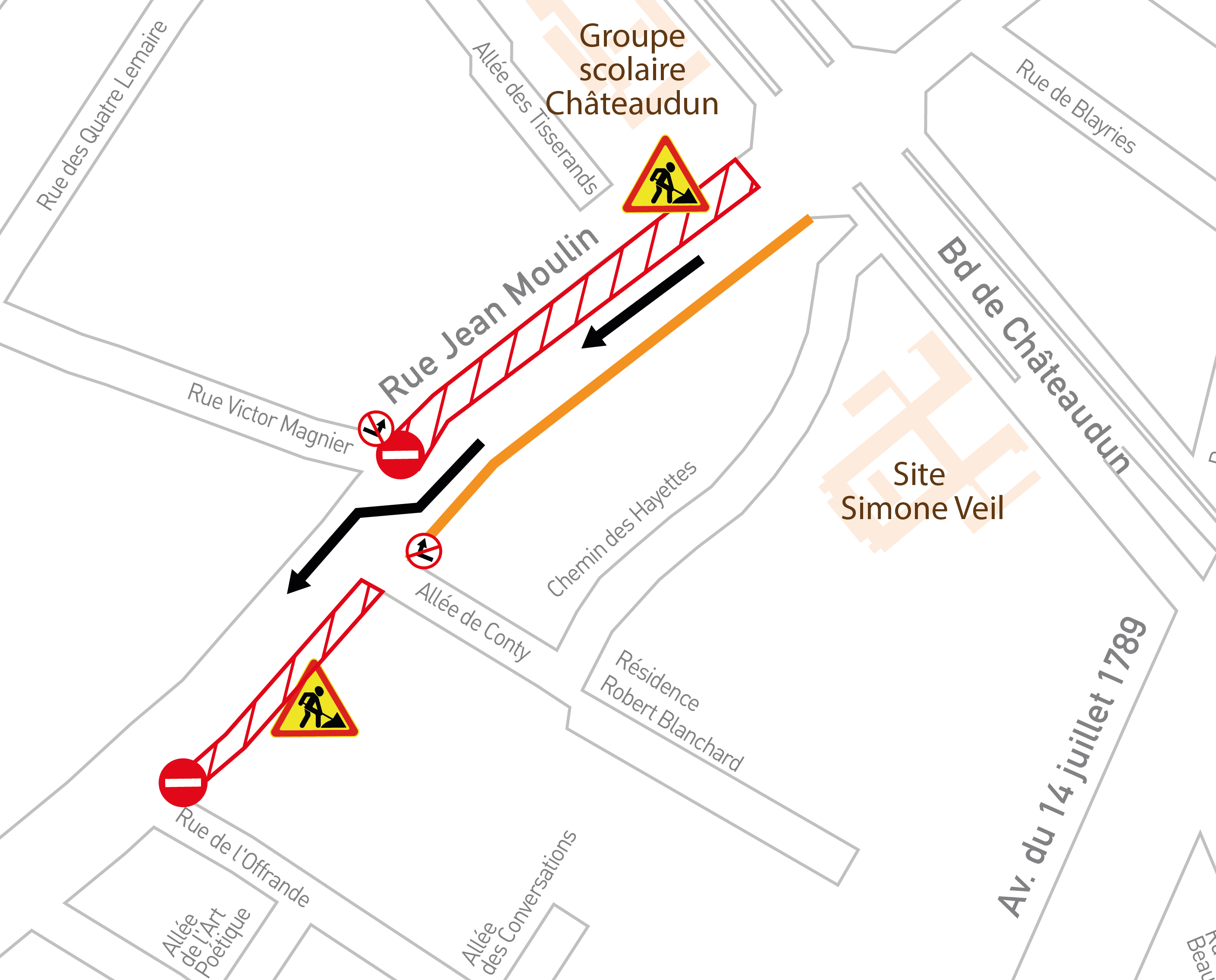 - Sens unique de circulation rue Jean Moulin du bd de châteaudun vers salouël pendant les travaux