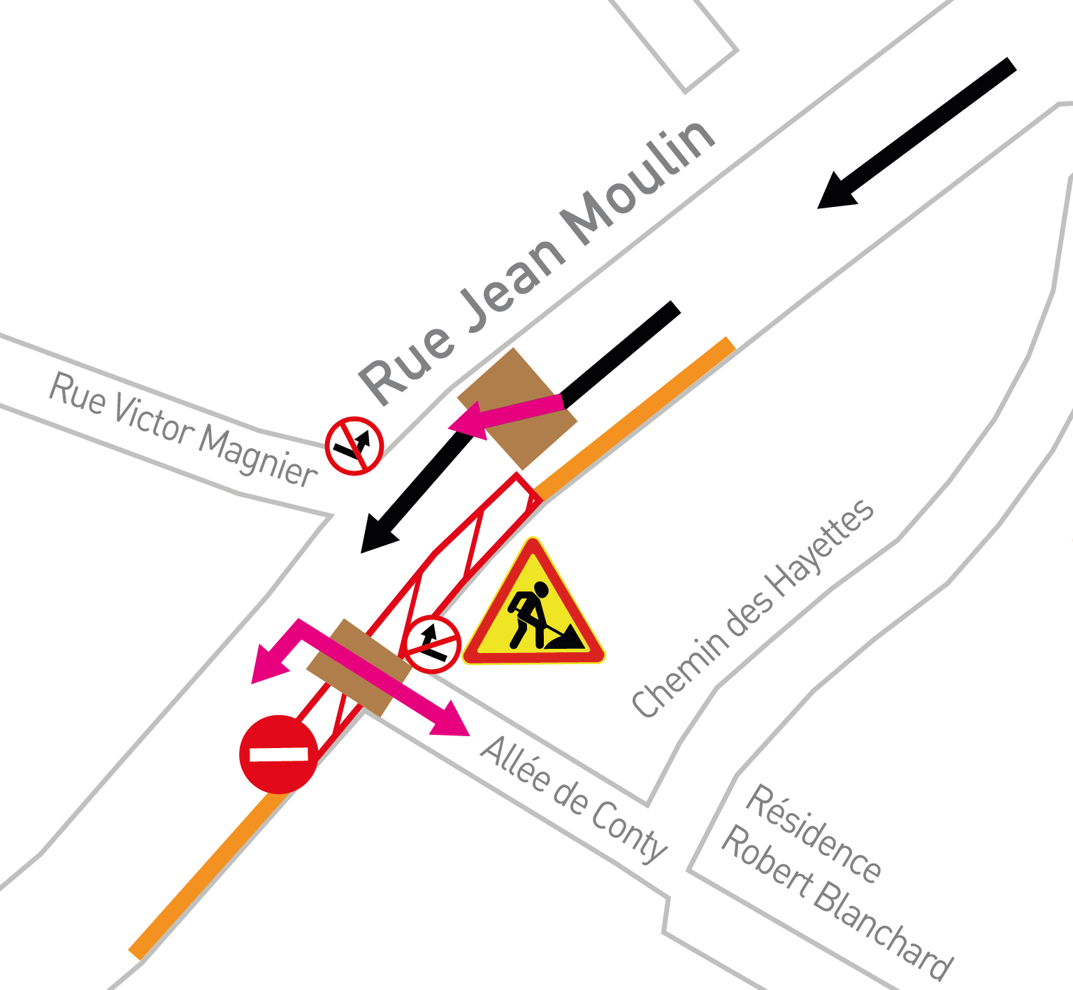 - Mise en impasse et en double sens de circulation du chemin des Hayettes qui sera annoncé sur la zone de travaux à l’avancement du chantier