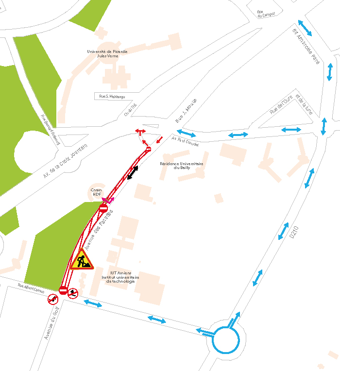 Avenue des Facultés barrée sauf accès Cnam HDF et bus par le nord jusqu’aux arrêts bus entre les avenues des Facultés et de la Croix Jourdain