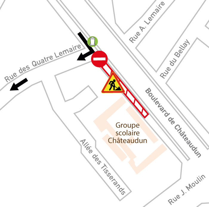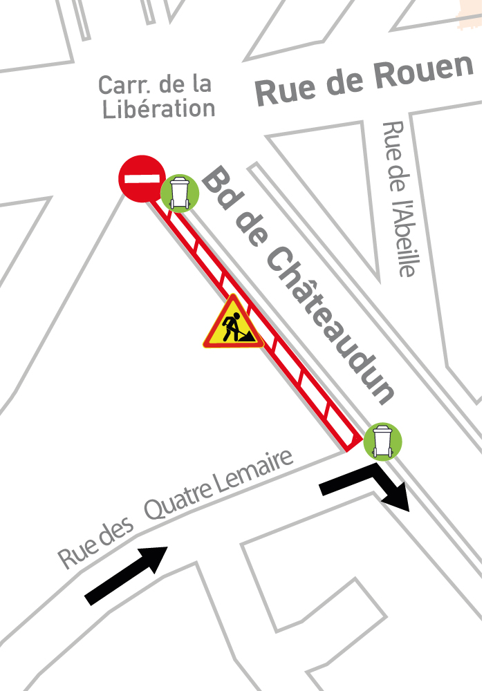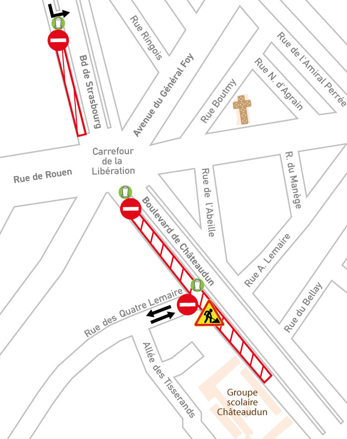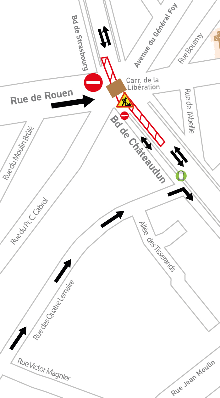 - Contre-allées boulevards de Strasbourg et de Châteaudun barrées dans le cadre des réfections définitives