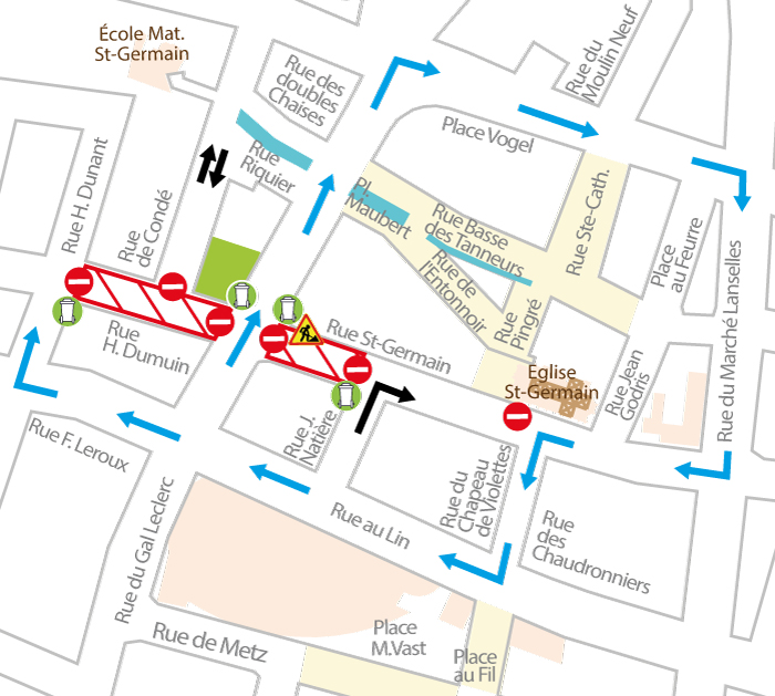 - Rue Saint-Germain barrée entre les rues du Général Leclerc et du Chapeau de Violettes