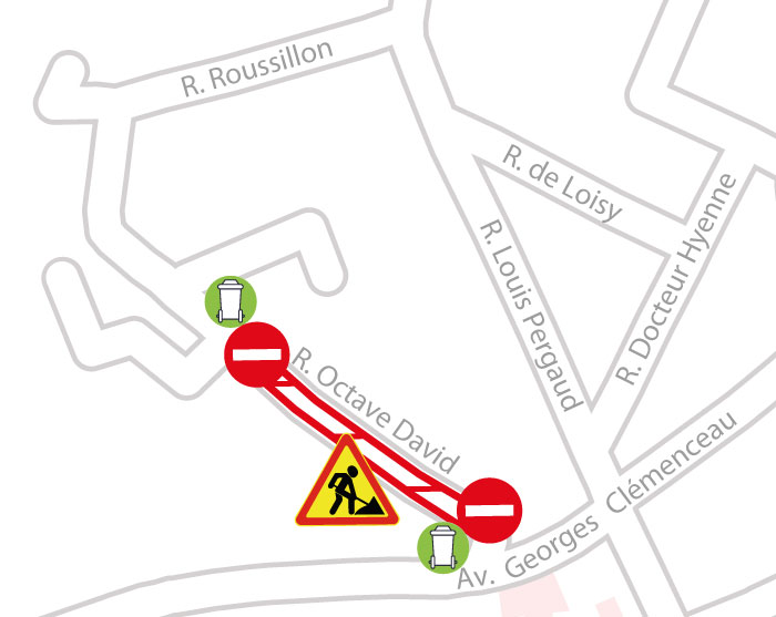 - Rue Octave David barrée entre le n° 30 et l’avenue Georges Clémenceau sauf accès riverains selon l’avancement des travaux
