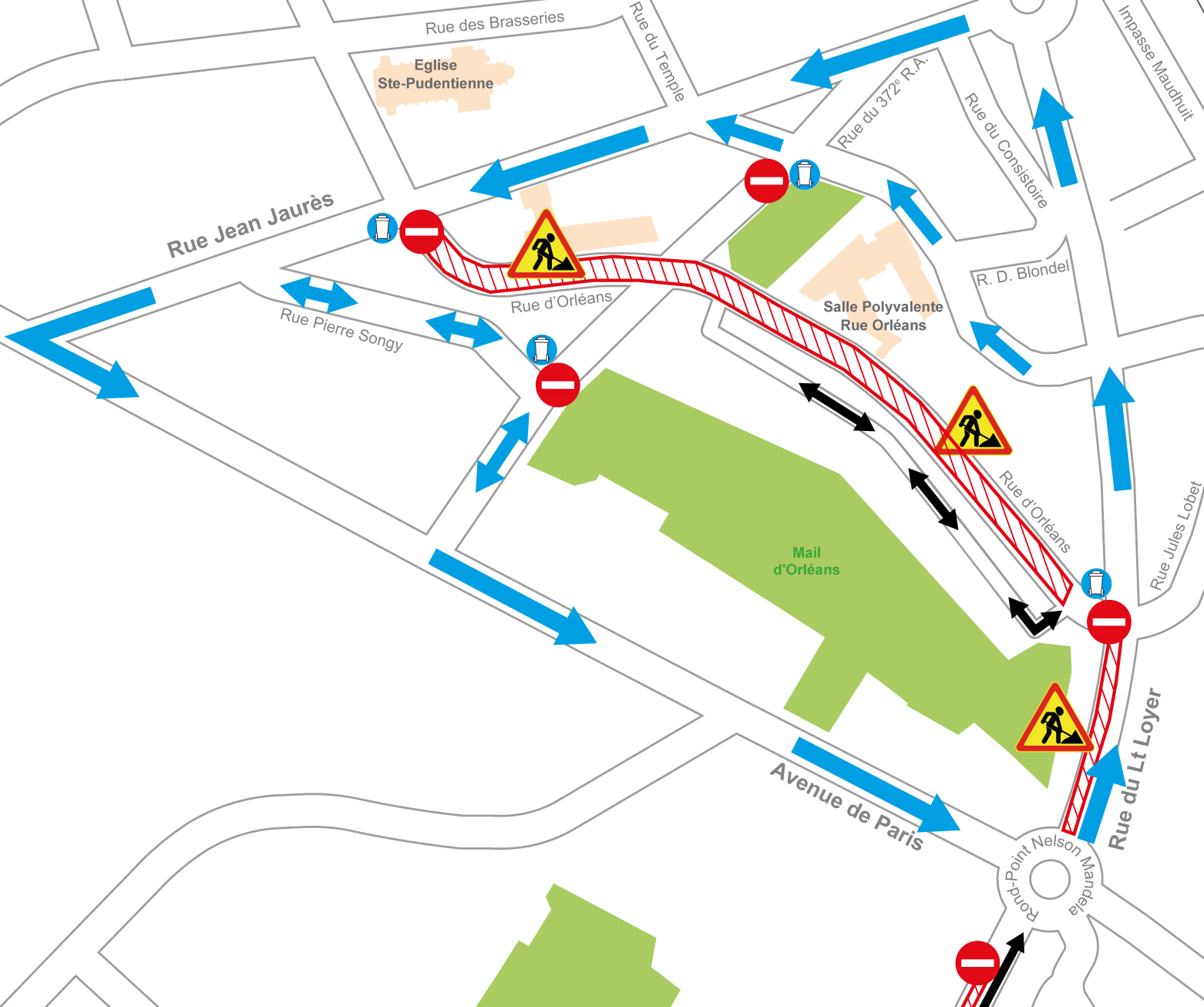 - Rue du 372e Régiment d’Artillerie barrée au niveau du carrefour avec la rue d’Orléans
