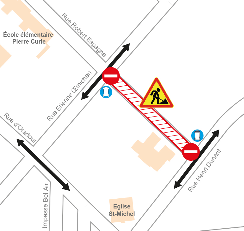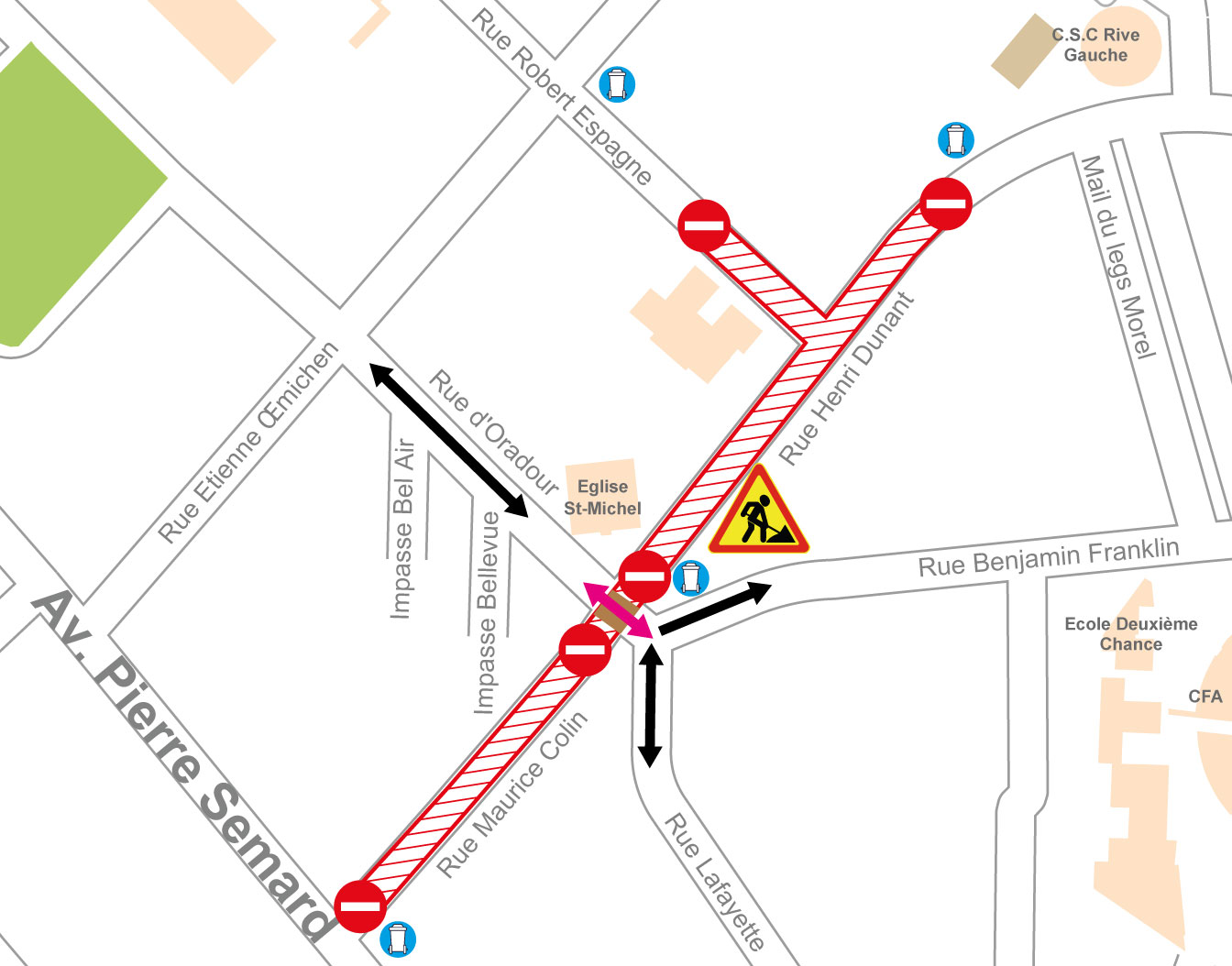 - Rue Henri Dunant barrée entre le n°25 et le carrefour avec la rue d’Oradour
