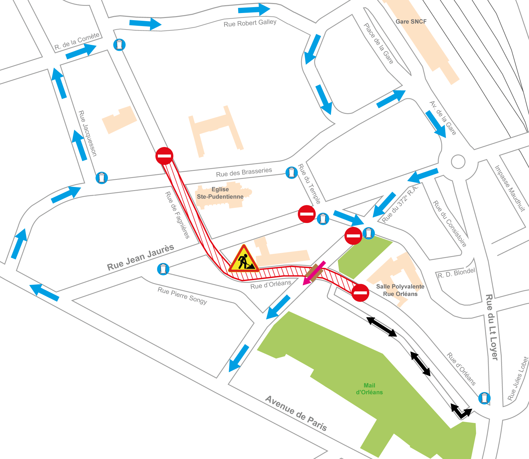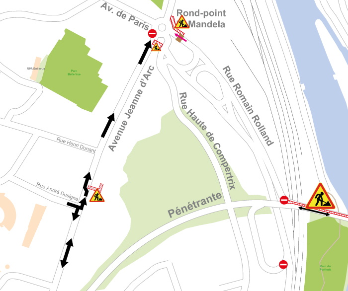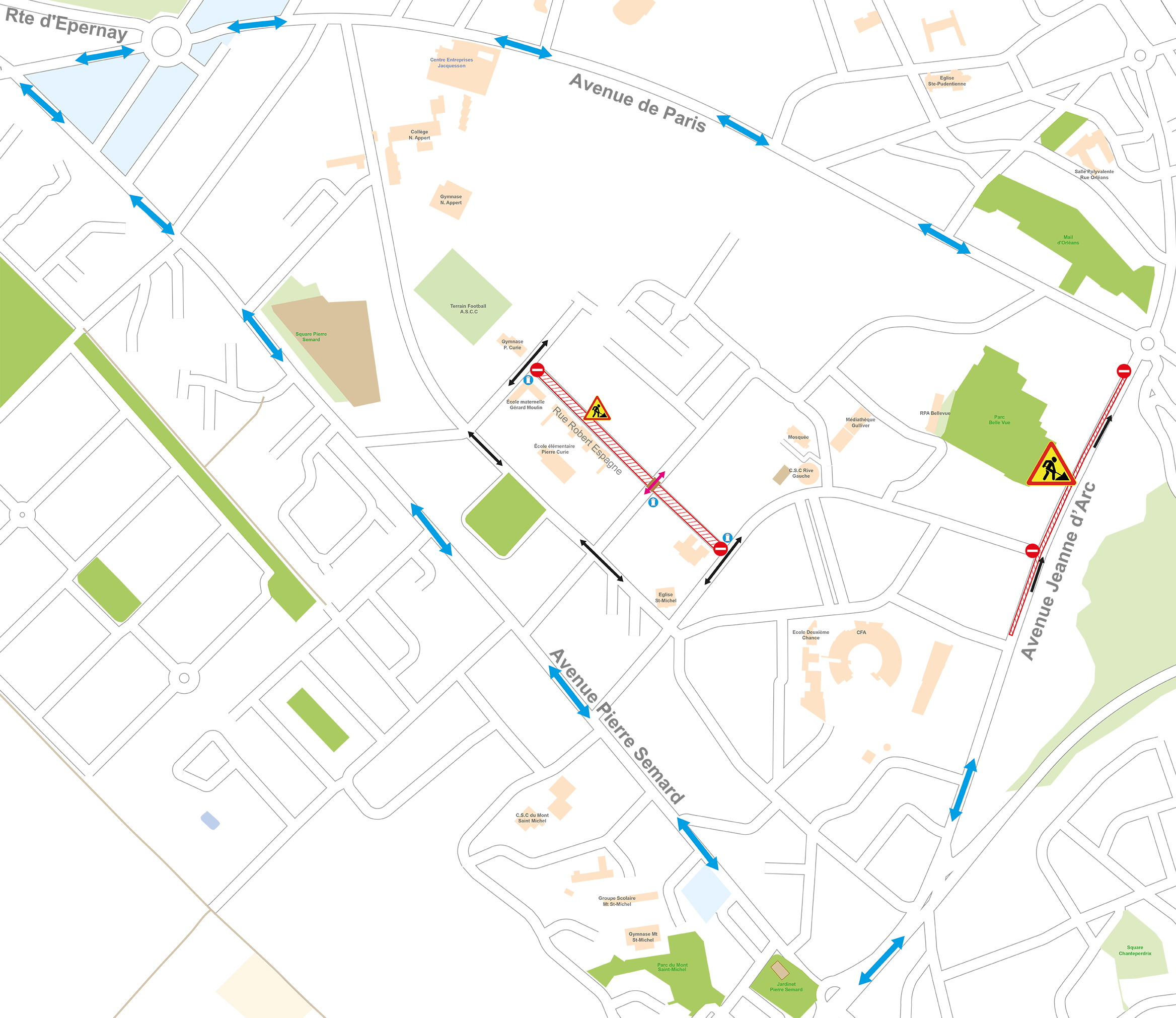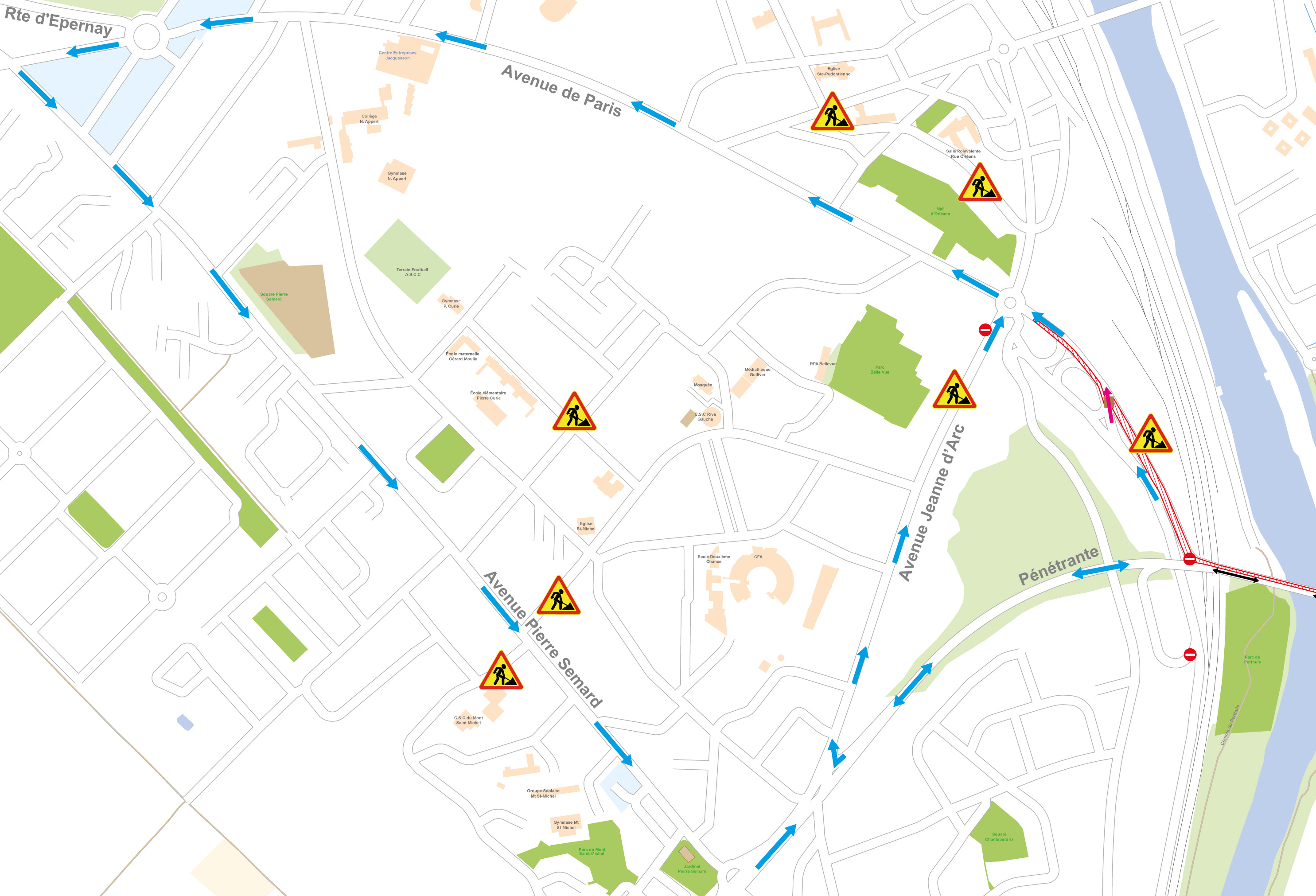 - Mise en sens unique de circulation de l’av. Jeanne d’Arc vers la gare à partir de la rue André Dusigne, déviation via l’avenue de Paris