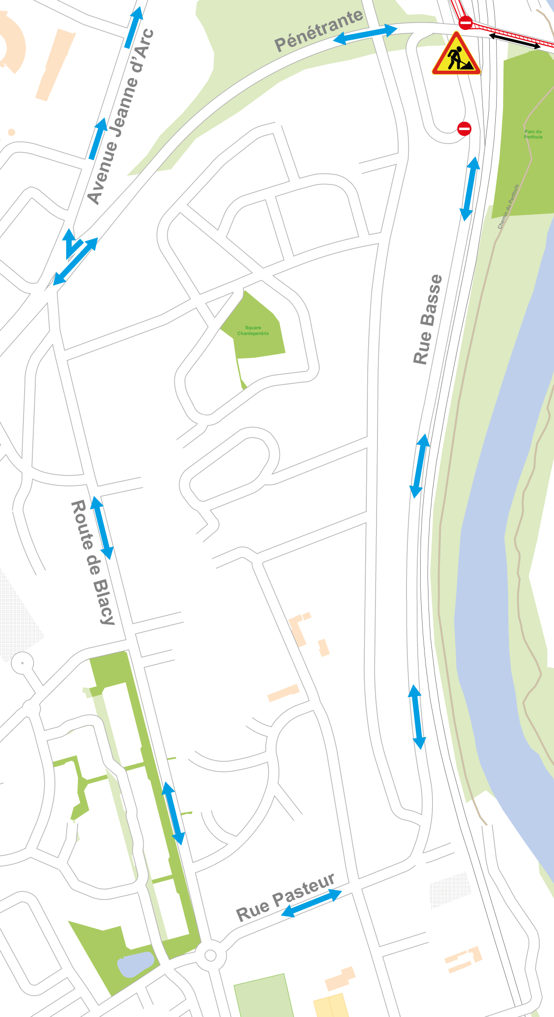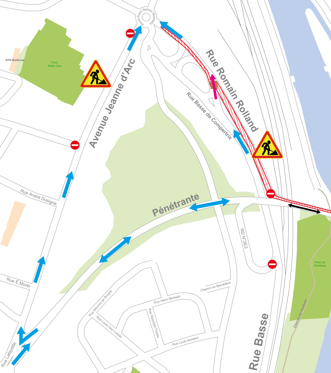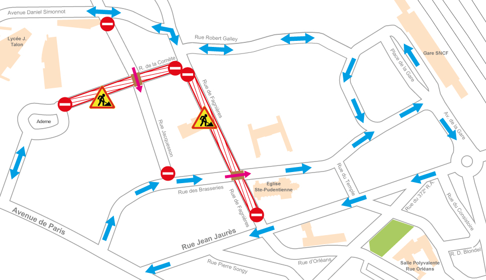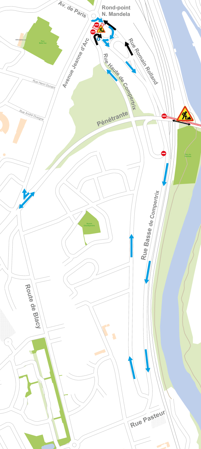 - Mise en sens unique de circulation de l’av. Jeanne d’Arc vers la gare à partir de la rue André Dusigne, déviation via l’avenue de Paris