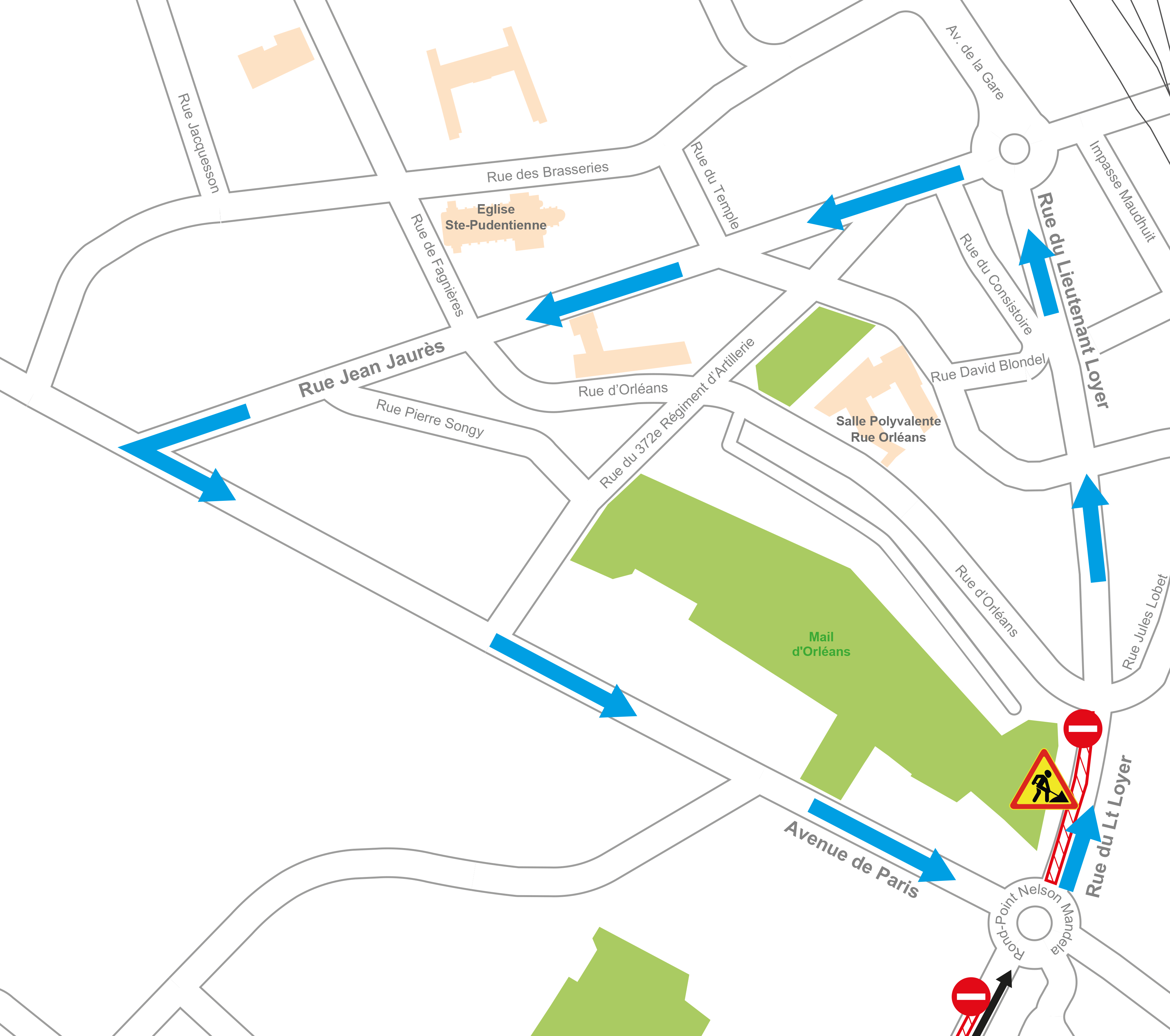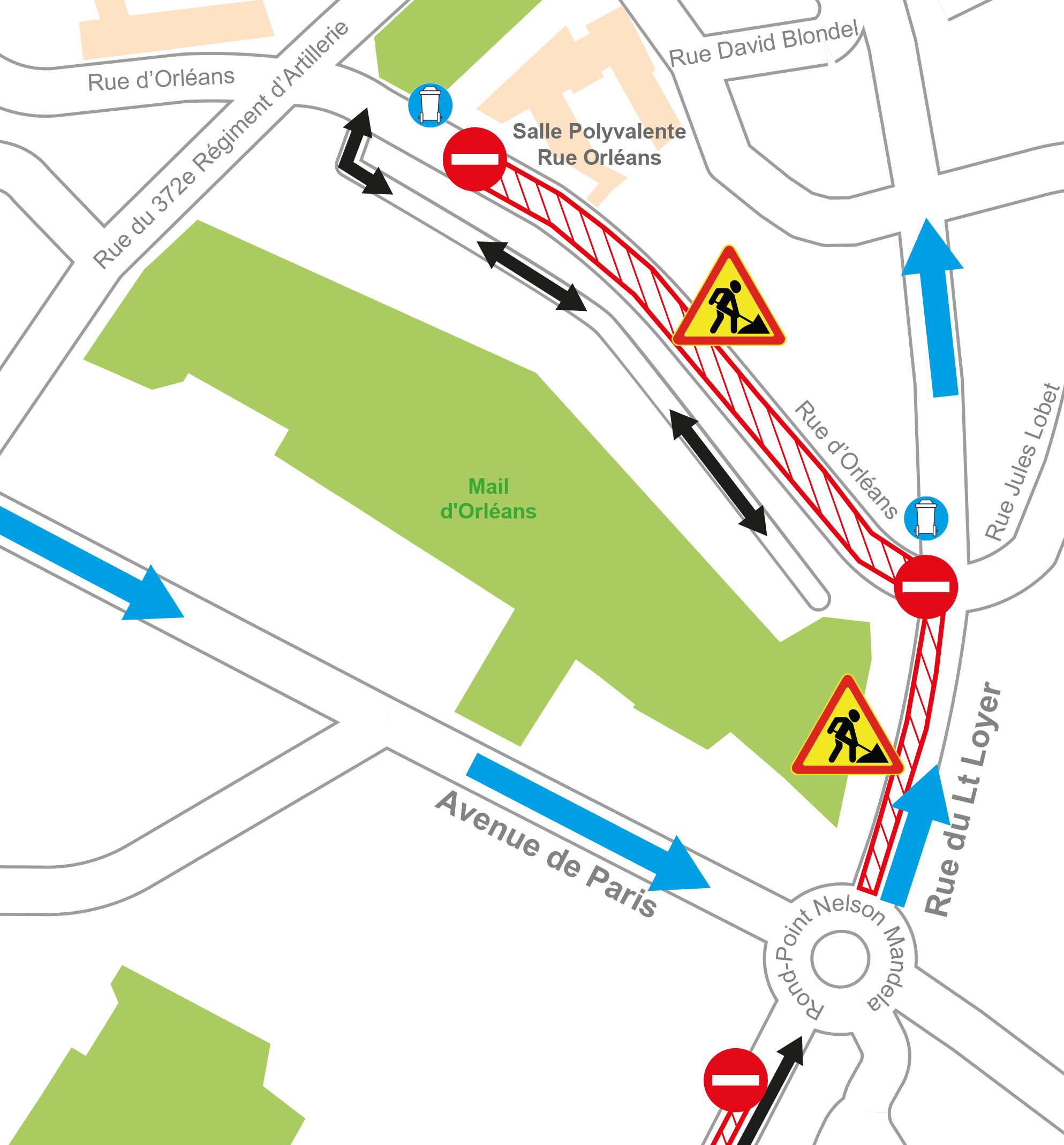 - Rue Lt Loyer barrée entre la rue d’Orléans et le rond-point Nelson Mandela