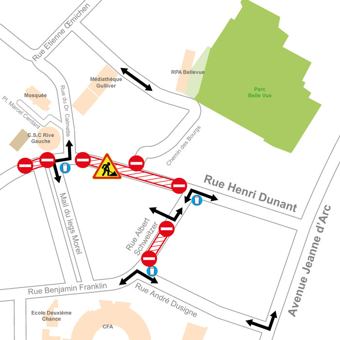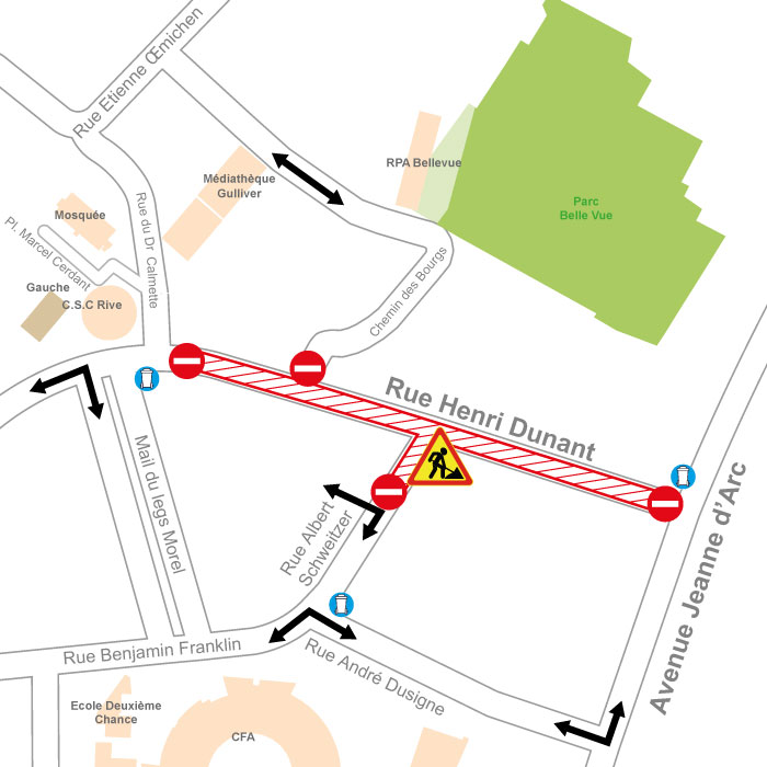 - Rue Henri Dunant barrée entre les rues A. Schweitzer et Dr Calmette et au carrefour avec le Mail du Leg Morel