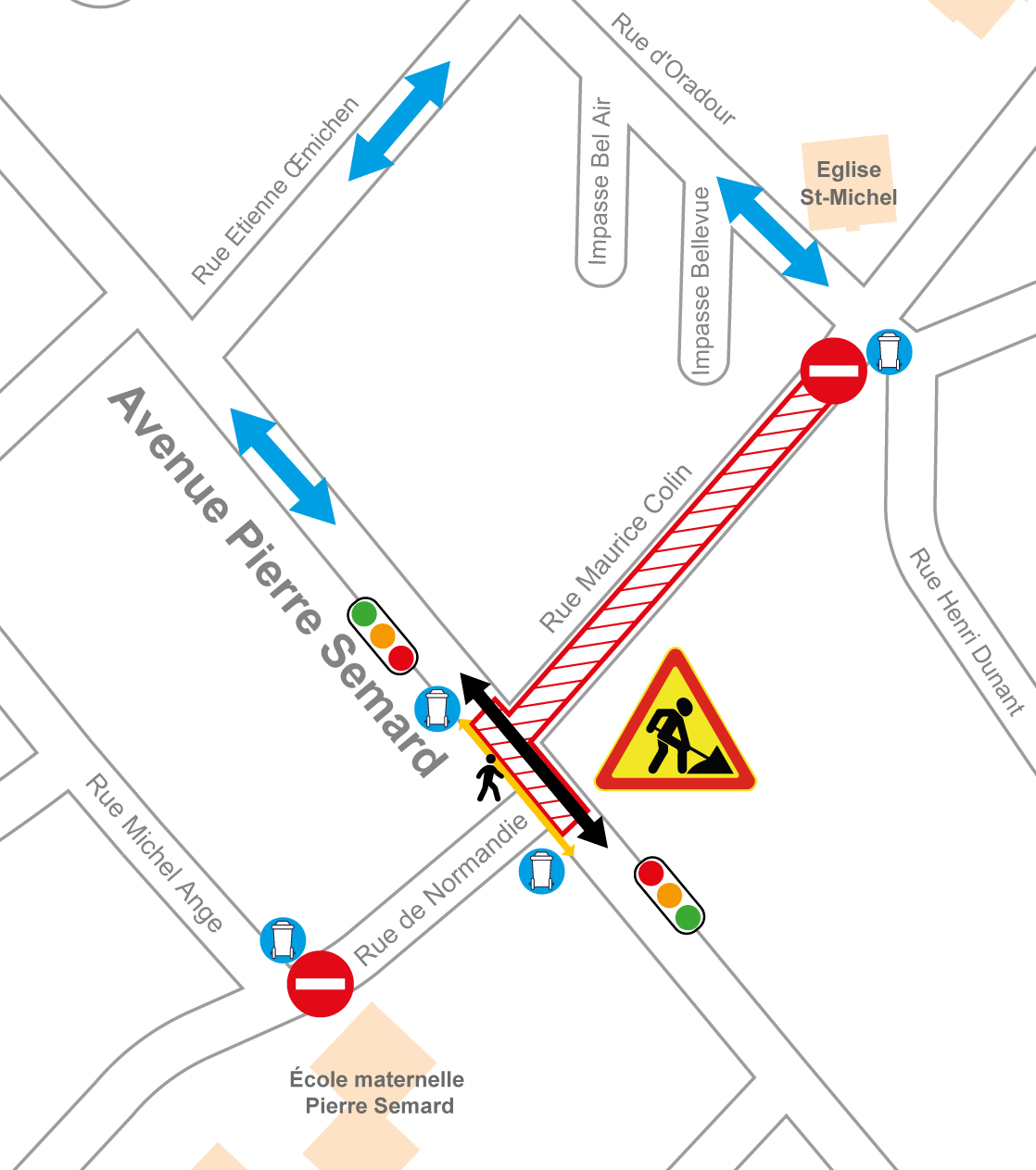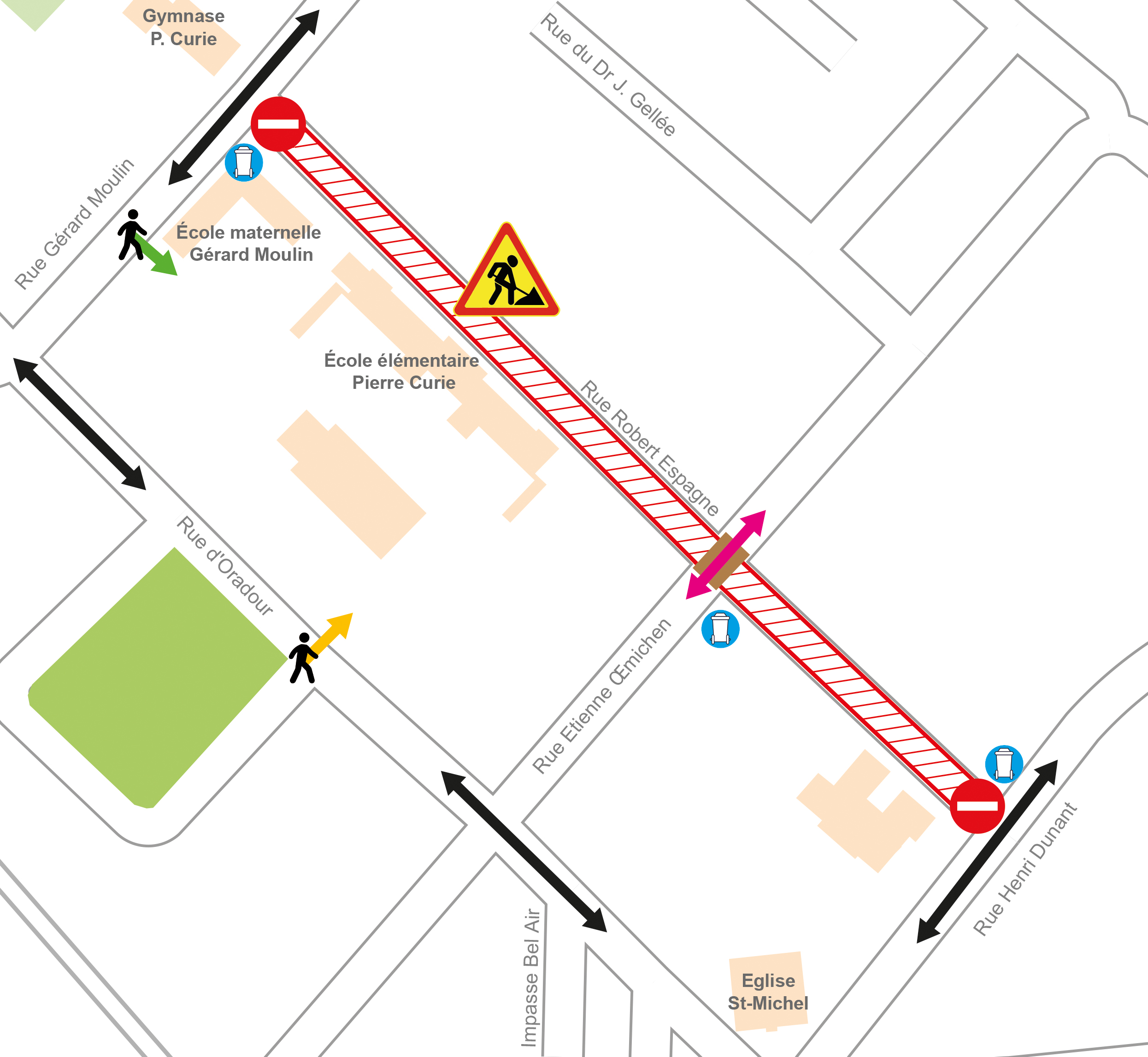 - Accès piéton écoles maintenu rue Gérard Moulin pour la maternelle et rue d’Oradour pour l’élémentaire