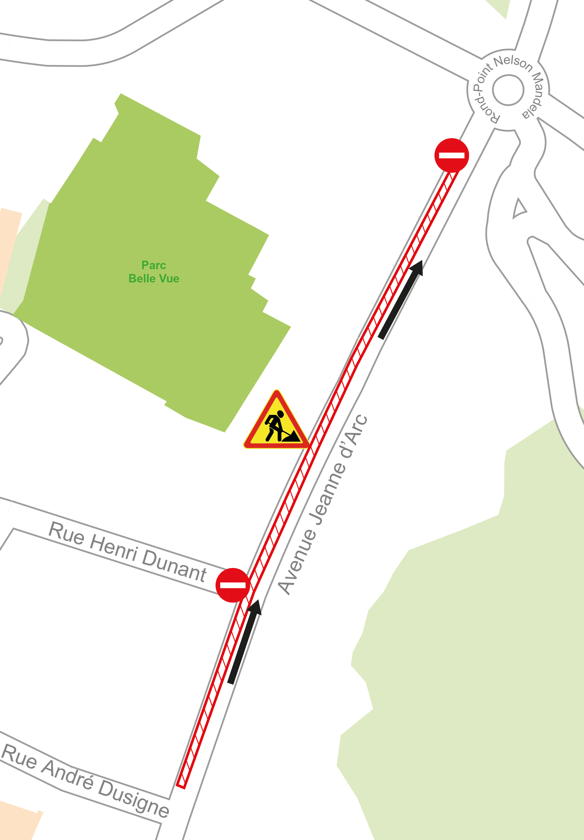 - Av. J. d’Arc barrée entre le rond point N. Mandela et la rue A. Dusigne