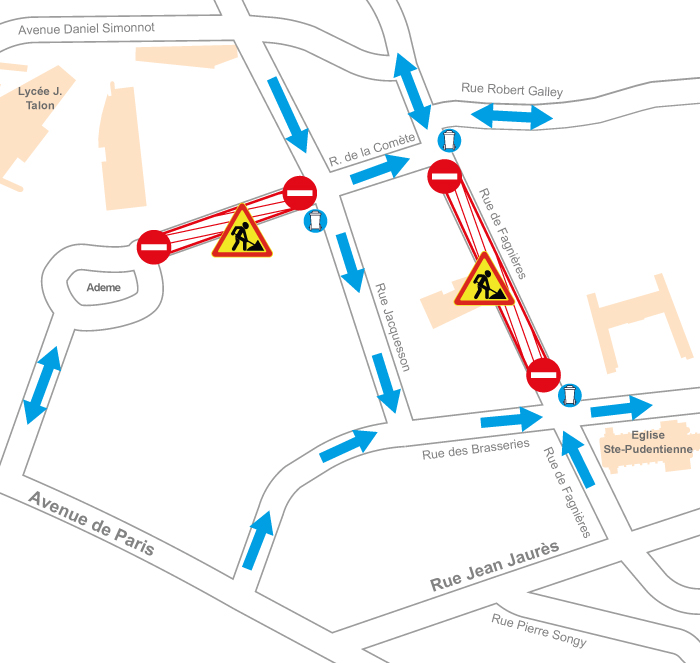- Rue de la Comète barrée entre la rue Jacquesson et l’Ademe puis entre la rue Jacquesson et la rue de Fagnières