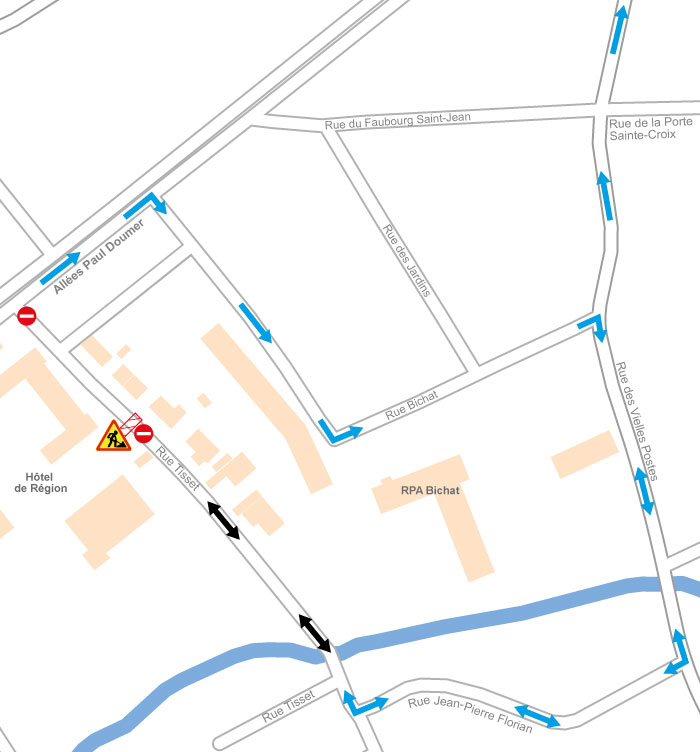 - Rue Tisset barrée entre l’allée Paul doumer et la rue Jean-Pierre Florian entre 7 h et 18 h, hors week-end et jours fériés