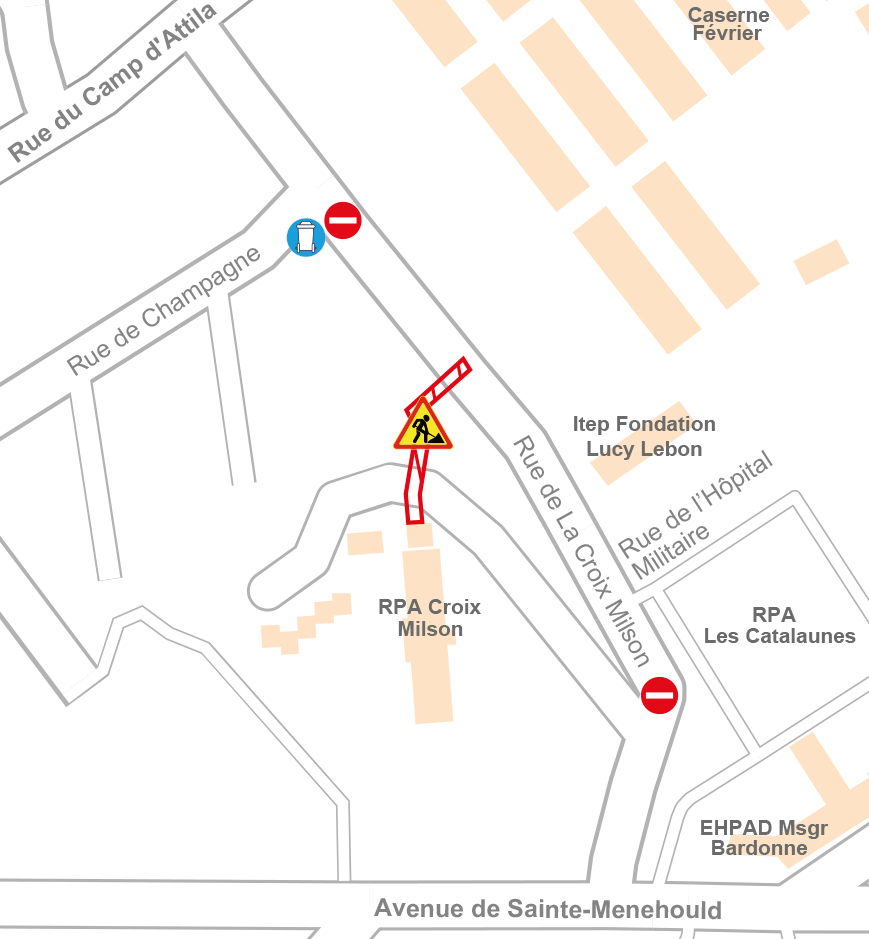 - Rue de la Croix Milson barrée sauf accès Itep Lucy Lebon et résidence Croix Milson par l’avenue Sainte-Menehould