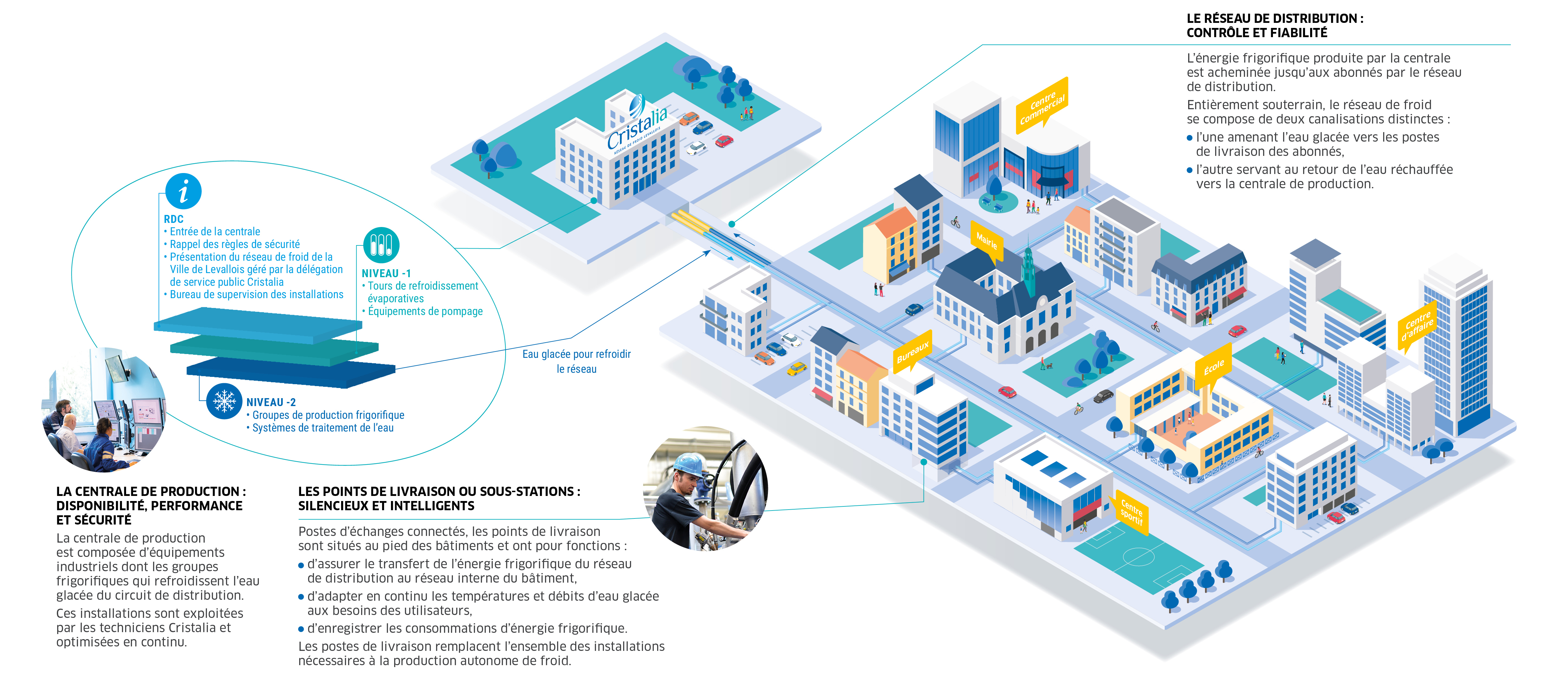 La société Cristalia est une filiale d’ENGIE Solutions. Dans le cadre d’une délégation de service public, elle est en charge de la mise en œuvre, de l’exploitation et du développement du réseau de froid de la ville de Levallois-Perret.