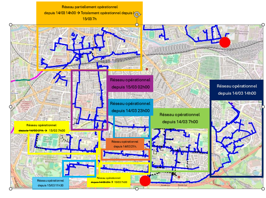 Le service d'alimentation en chauffage et eau chaude sanitaire est désormais rétabli sur l'ensemble du réseau, hormis dans les batiments commerciaux du secteur de l'Alma.
