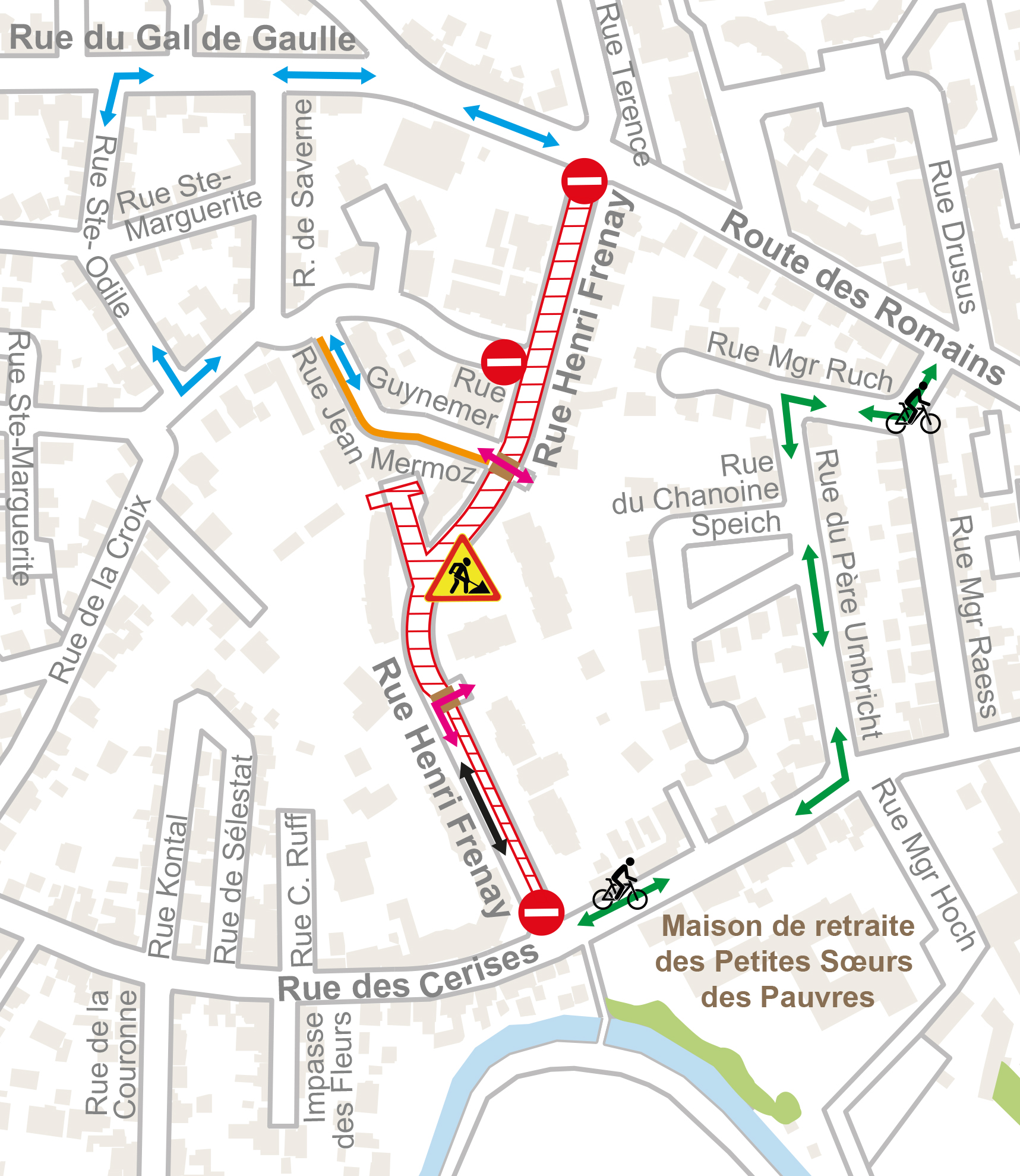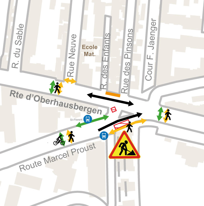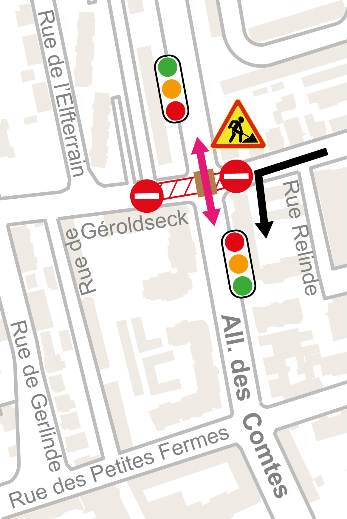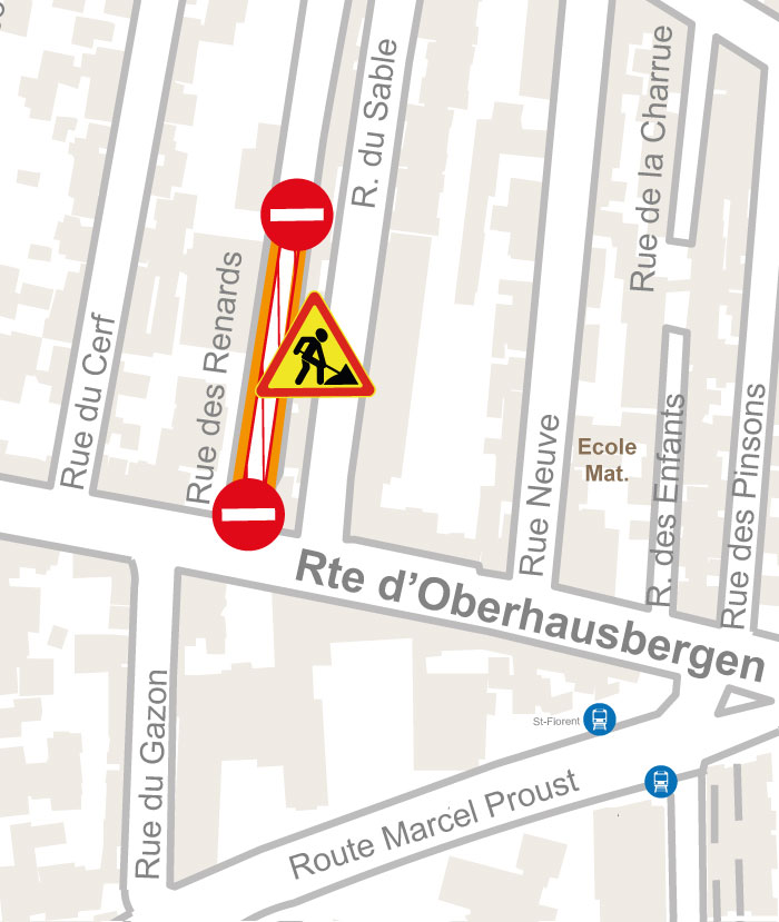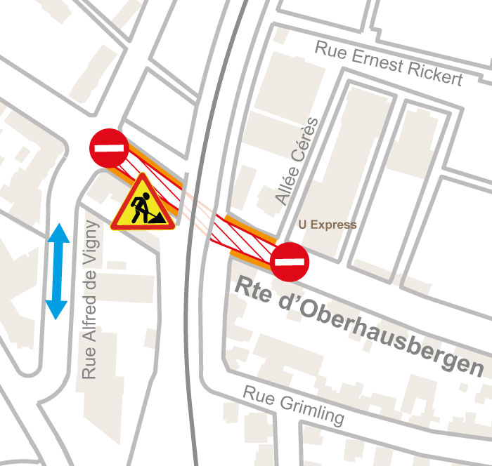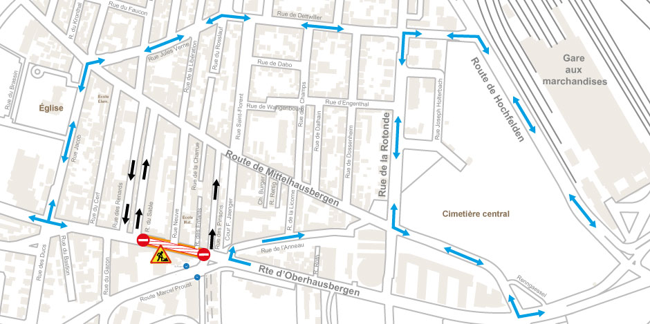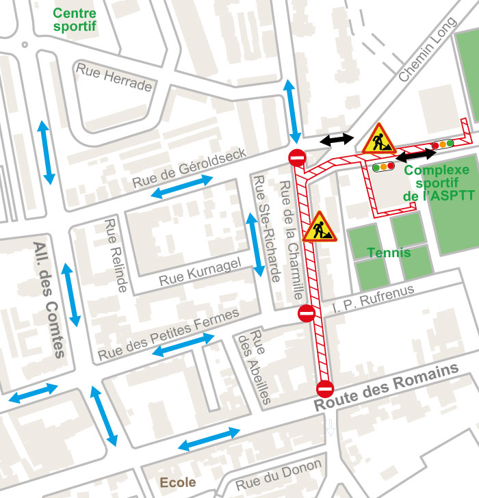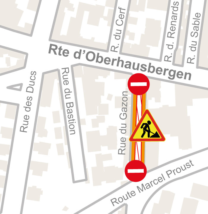 - Une fois les travaux de la rue de l’Elfterrain terminés, la rue sera mise en impasse jusque la fin des travaux de la rue de Geroldseck