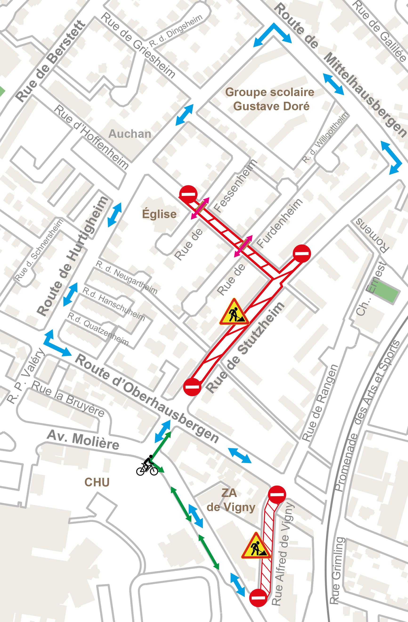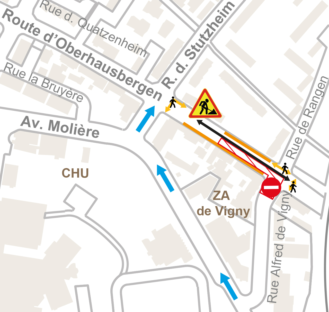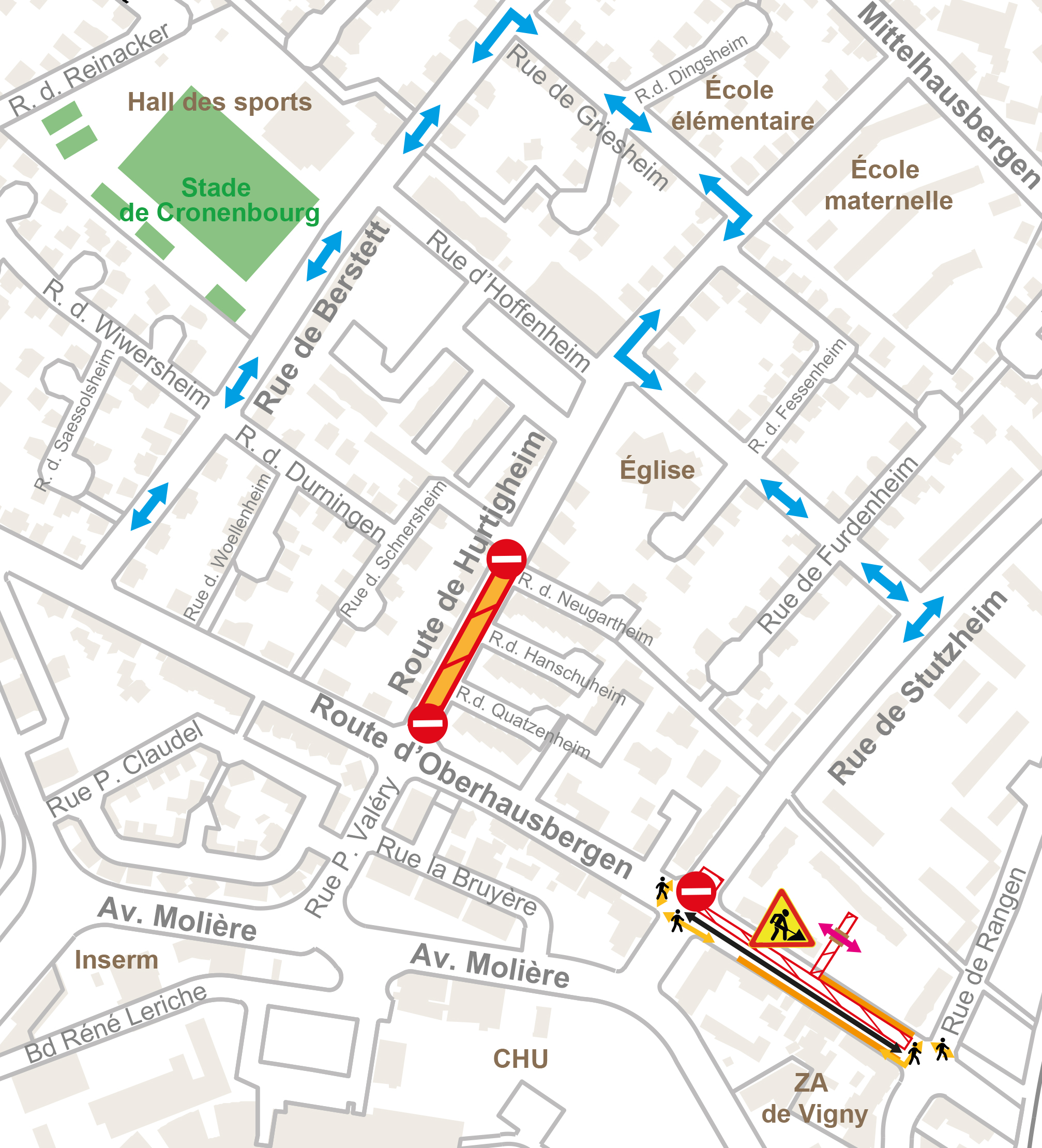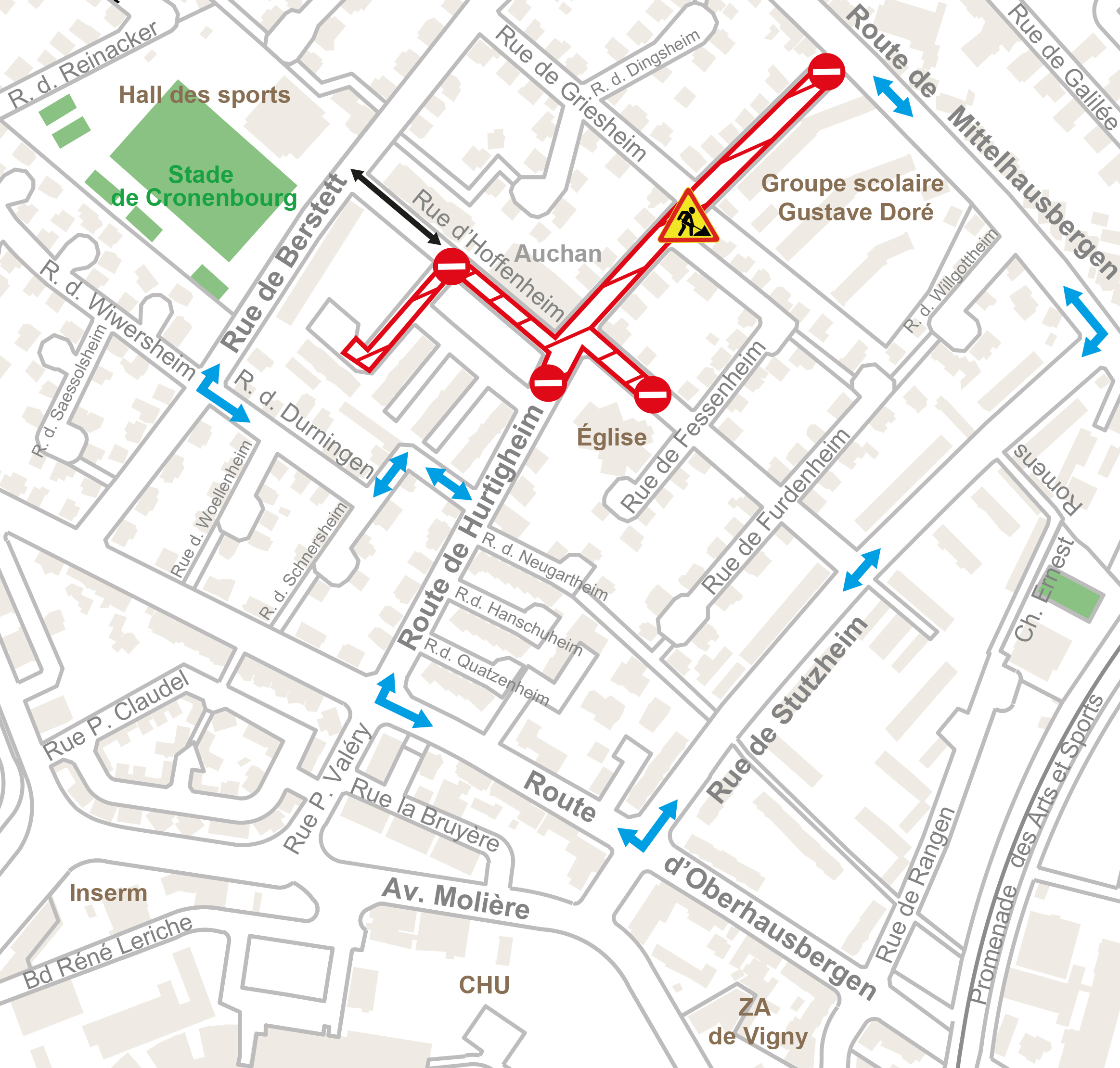 - Rues de Stutzheim, d’Offenheim, de Hurtigheim et place Saint-Antoine barrées sauf accès riverains suivant l'avancée des travaux