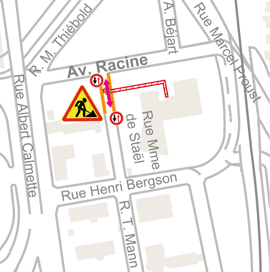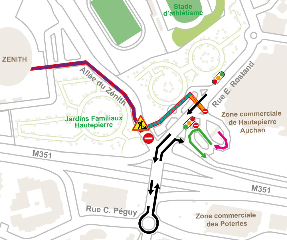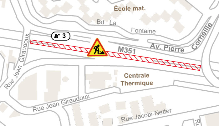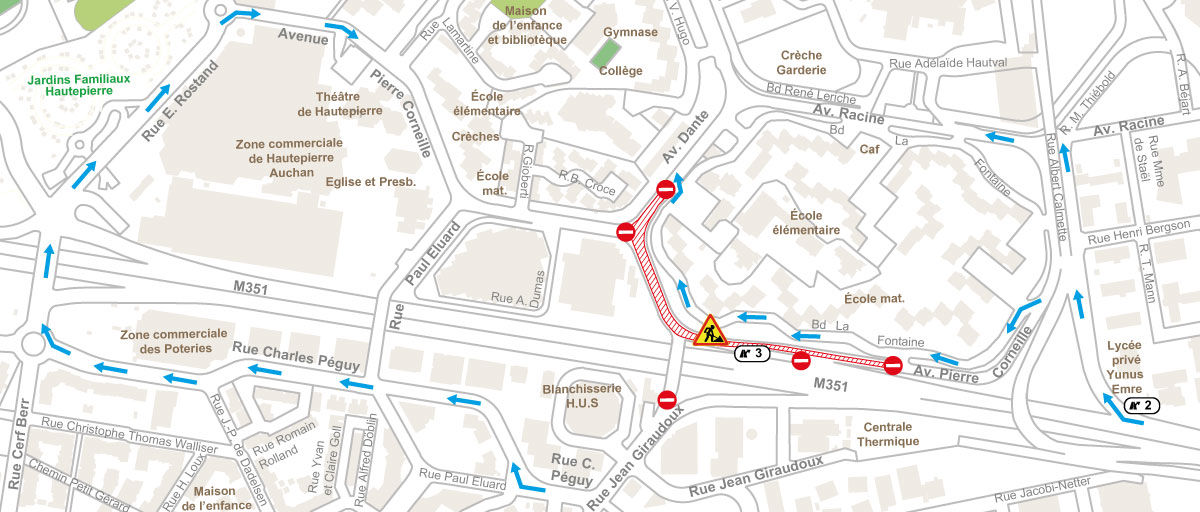 - Rue J. Giraudoux barrée au droit du pont sur M351, déviation par rues C. Péguy, E. Rostand puis av. Corneille