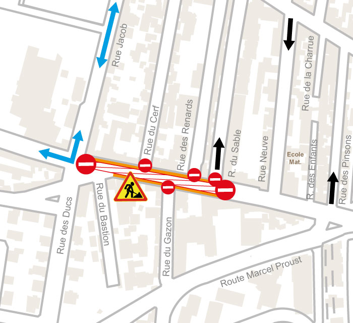 - Interdiction de stationner de long de la zone de travaux et rue Jean Mermoz