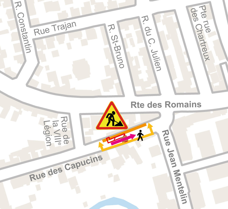 - Rue Henri Frenay barrée entre la rue des Capucins et la route des Romains sauf accès riverains jusqu’au n°12