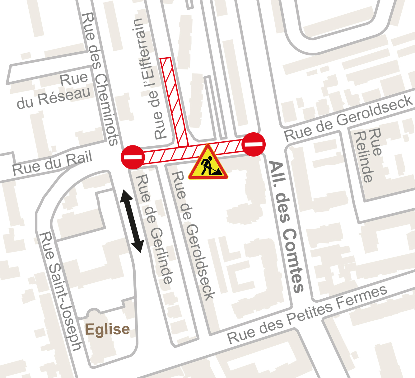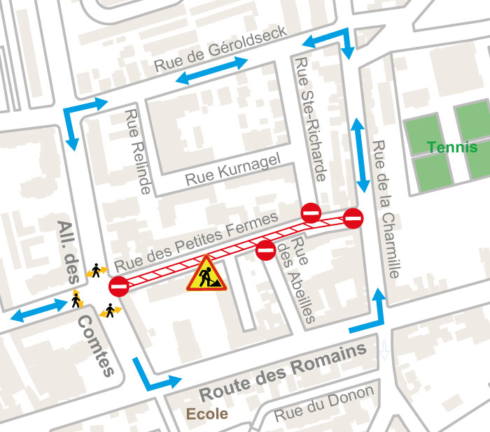 - Rue des Petites Fermes barrée sauf riverains entre l’allée des Comtes et la rue de la Charmille
