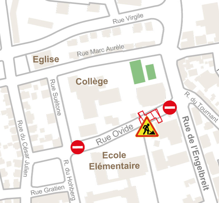 - Rue Terence barrée sauf accès riverains entre la route des Romains et la rue Virgile