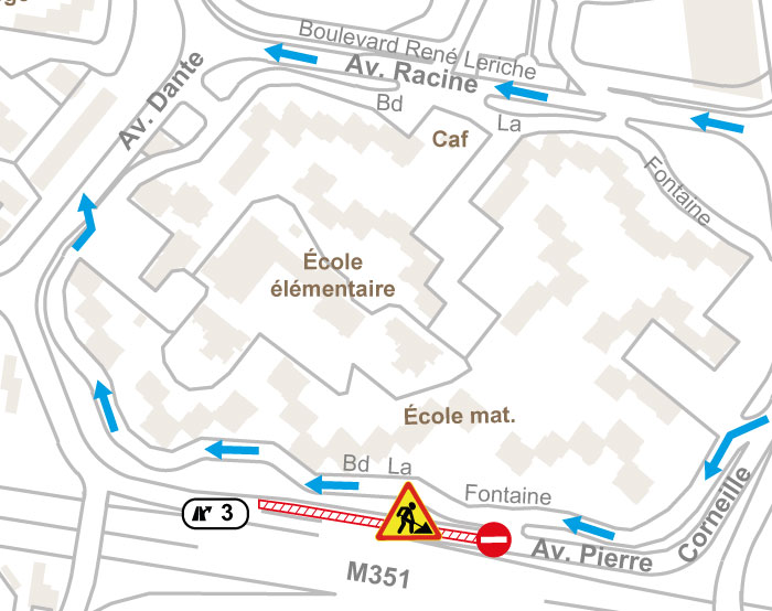 - Av. Pierre Corneille et Dante barrées /Accès avenue Racine par sortie CHU N°2 de M351