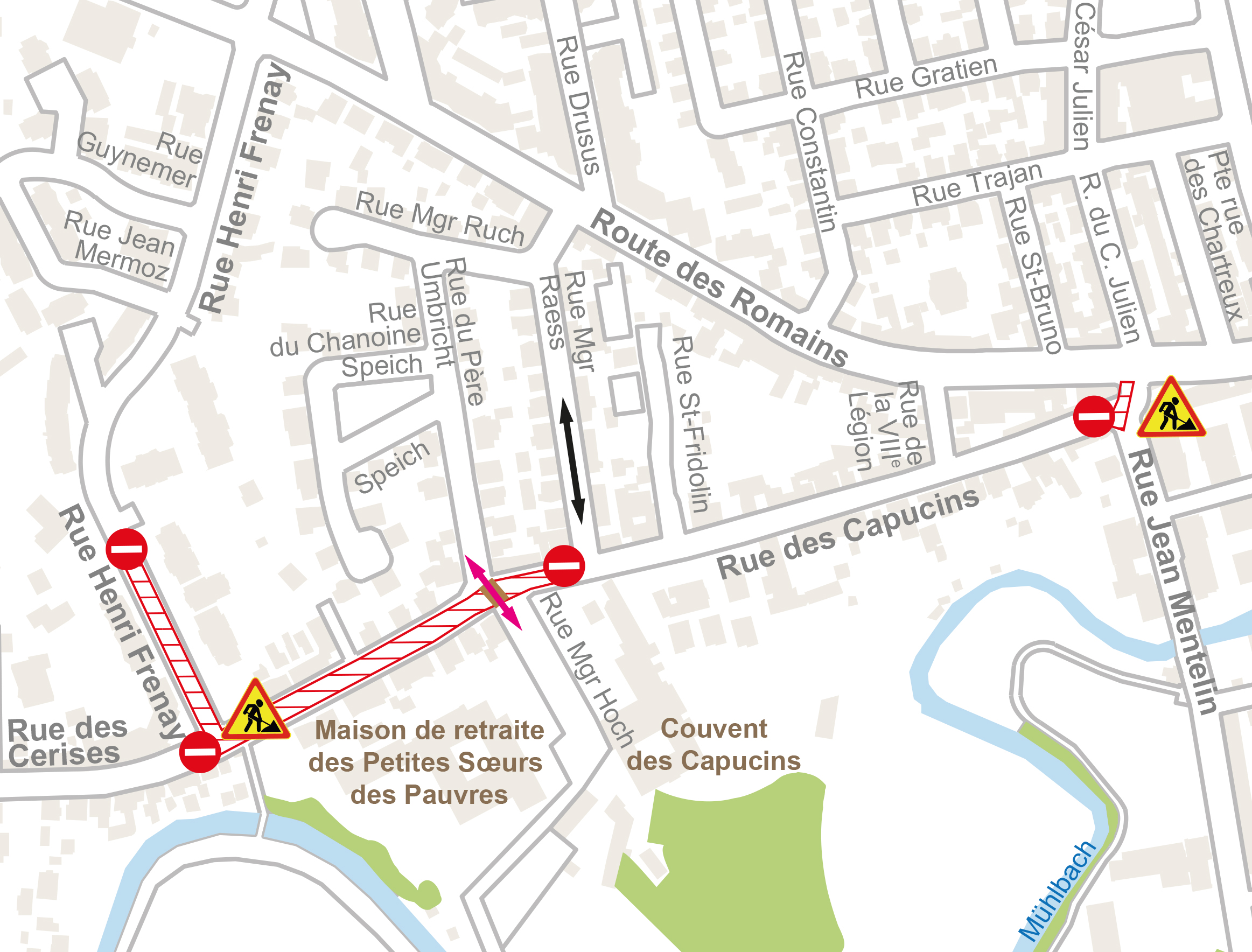 - Rue des Capucins mise en route barrée de la rue Mgr Raess jusqu’après le croisement avec la rue Henry Frenay (n°12)