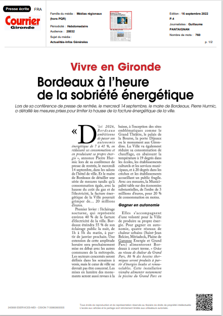 Ce vendredi 16 septembre 2022, Courrier Gironde publie un article sur les mesures prises pour limiter la hausse de la facture énergétique de la ville de Bordeaux.