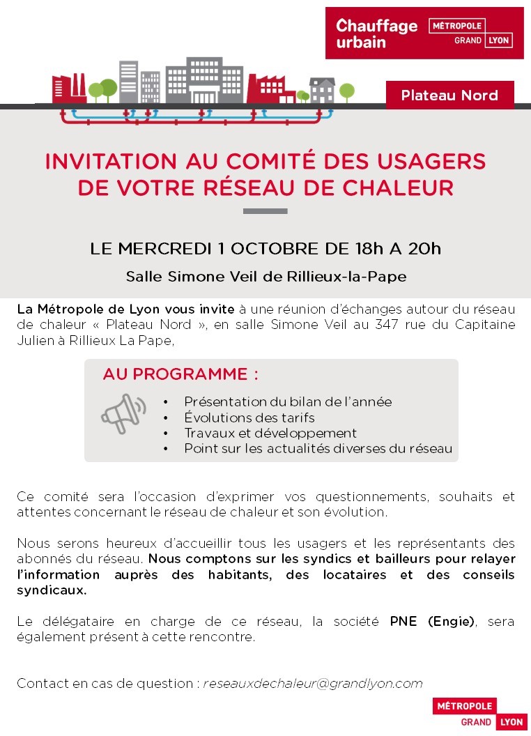 Rillieux-la-Pape, Sathonay Camp, Caluire-et-Cuire, Fontaines-sur-Saône, Lyon 4 - INVITATION AU COMITE DES USAGERS DE VOTRE RESEAU DE CHALEUR