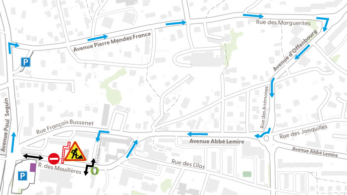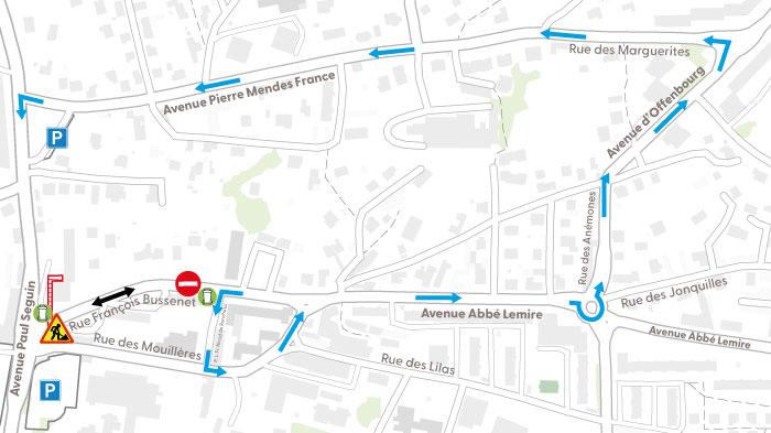 - Accès des résidents maintenu par la mise en double sens de circulation de la rue François Bussenet depuis rue Louis F. N. de Ronchaux