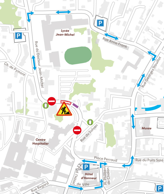 - Rue du Docteur Jean-Michel barrée entre la rue du Solvan et le parking de l’hôpital