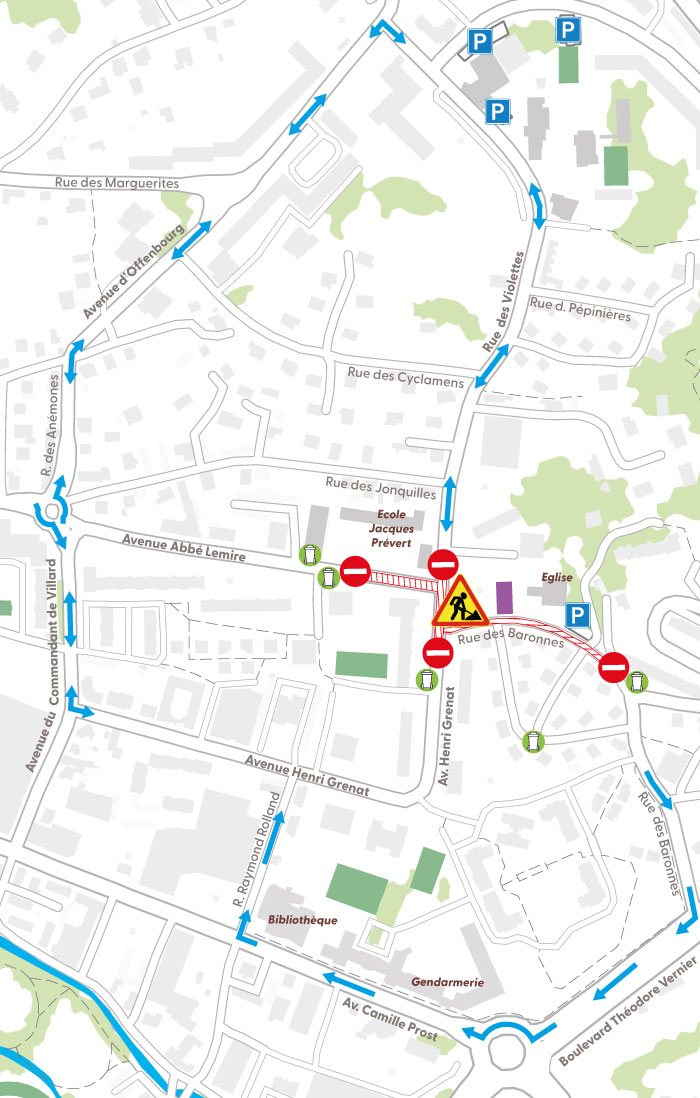 - Rue des Baronnes barrée entre la rue des Gentianes et l’avenue Henri Grenat