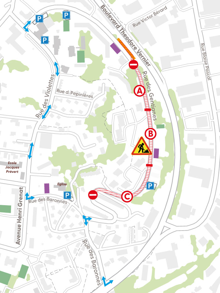 - Rue des Gentianes barrée des nos 200 à 765 en trois phasages successifs (A, B et C) sauf accès riverains