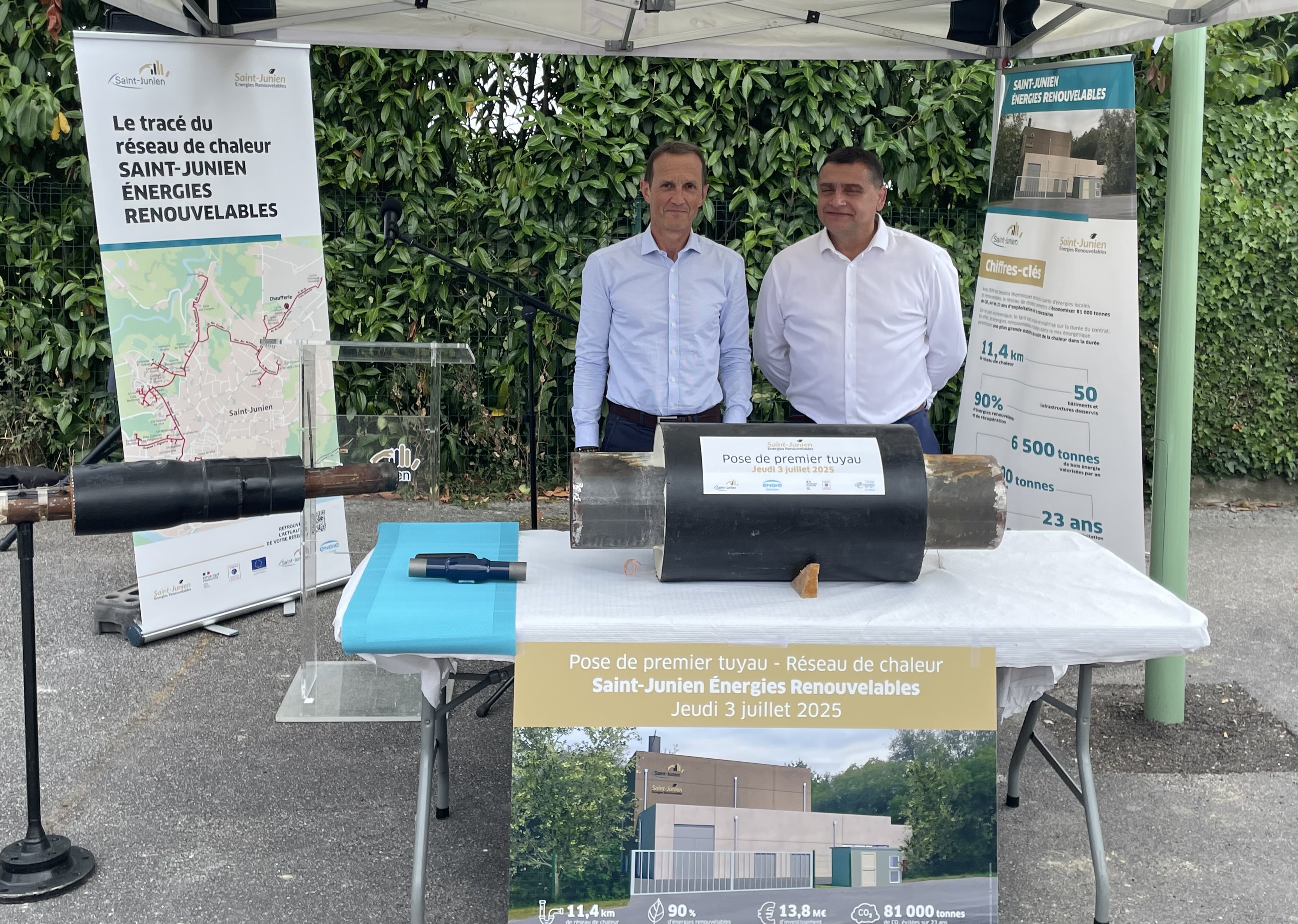Jeudi 3 juillet, la ville de Saint-Junien et ENGIE Solutions ont eu le plaisir de réaliser une Pose de premier tuyau afin de marquer le démarrage officiel des travaux du réseau de chaleur de Saint Junien Energies Renouvelables. Un geste symbolique suivi des discours d'Hervé BEAUDET, Maire de la ville de Saint-Junien et Albert PEREZ, Directeur du territoire Sud-Ouest.