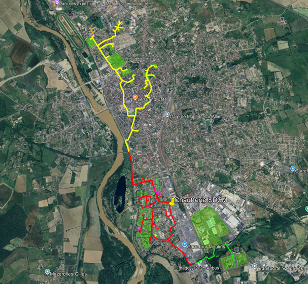 Le réseau de chaleur de la ville de Moulins est équipé de 2 chaudières à bois de 4 MW et 5 MW. Elles permettent de couvrir en biomasse 70 % des besoins en énergie.