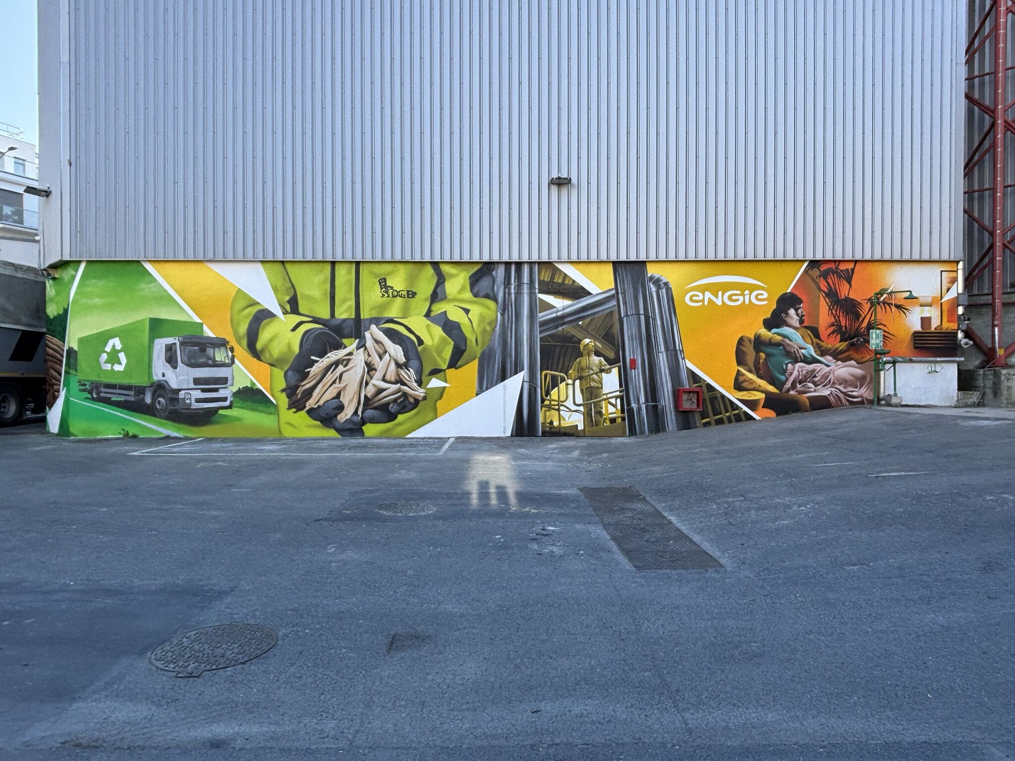En cette fin de mai, notre chaufferie biomasse SDCB s’est refait une beauté. Un mur de 90 m² transformé en œuvre d’art par le collectif LA CRÈME, mené par Romain Bernard avec les artistes RED, SINCK et OTAM.