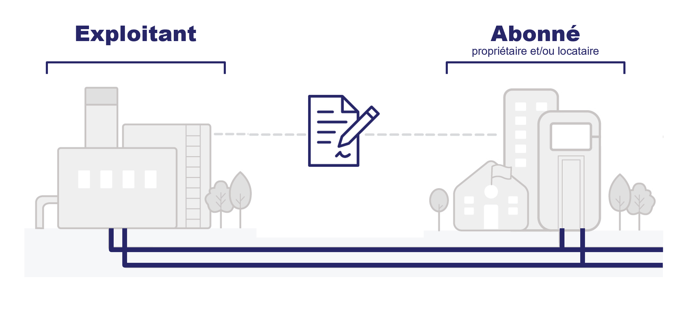 Pour prendre en charge la gestion des installations (production, transport et distribution de froid) jusqu’au pied des bâtiments, un contrat est signé avec le propriétaire de l’immeuble concerné par le raccordement au réseau de froid urbain, et/ou le locataire dûment autorisé par le propriétaire (foncières immobilières, collectivité locale pour les bâtiments publics). Ce contrat d’abonnement concerne la fourniture de froid jusqu’au poste de livraison dans le bâtiment et indique la puissance installée.