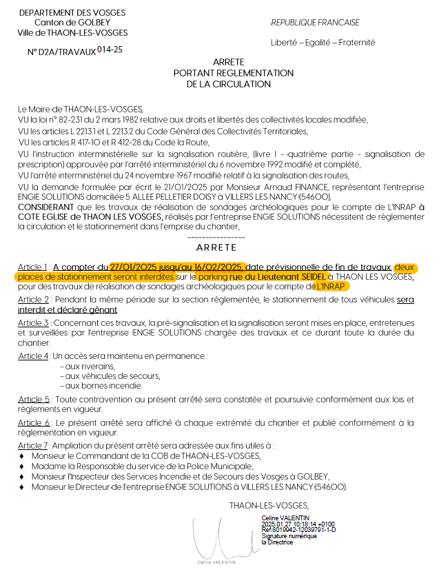THAON-LES-VOSGES - Travaux - Parking rue du Lieutenant Seidel - Du 27/01/25 au 16/02/25