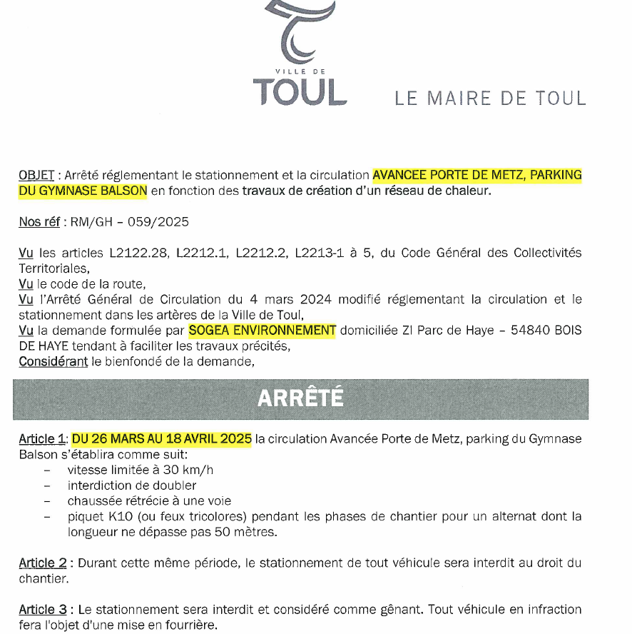 TOUL - Travaux Avancée Porte de Metz et Parking de la Halle des Sports Balson
